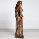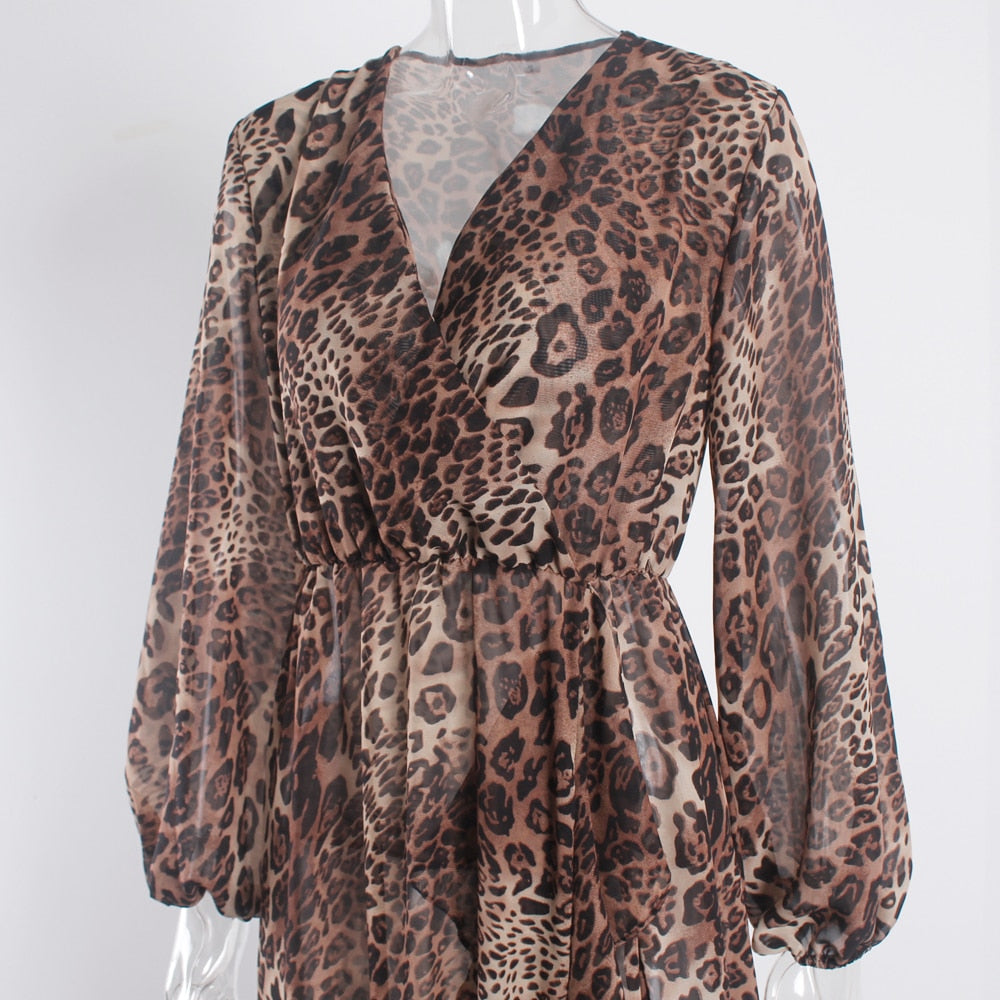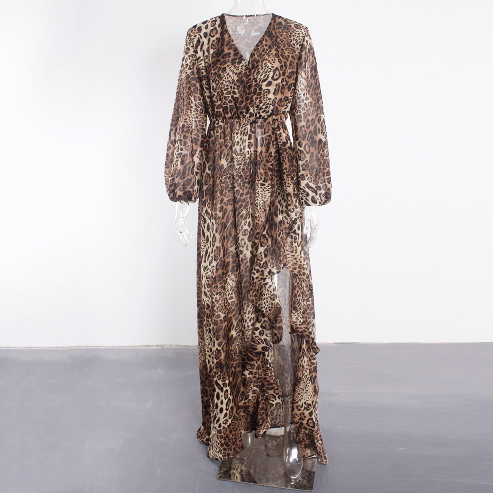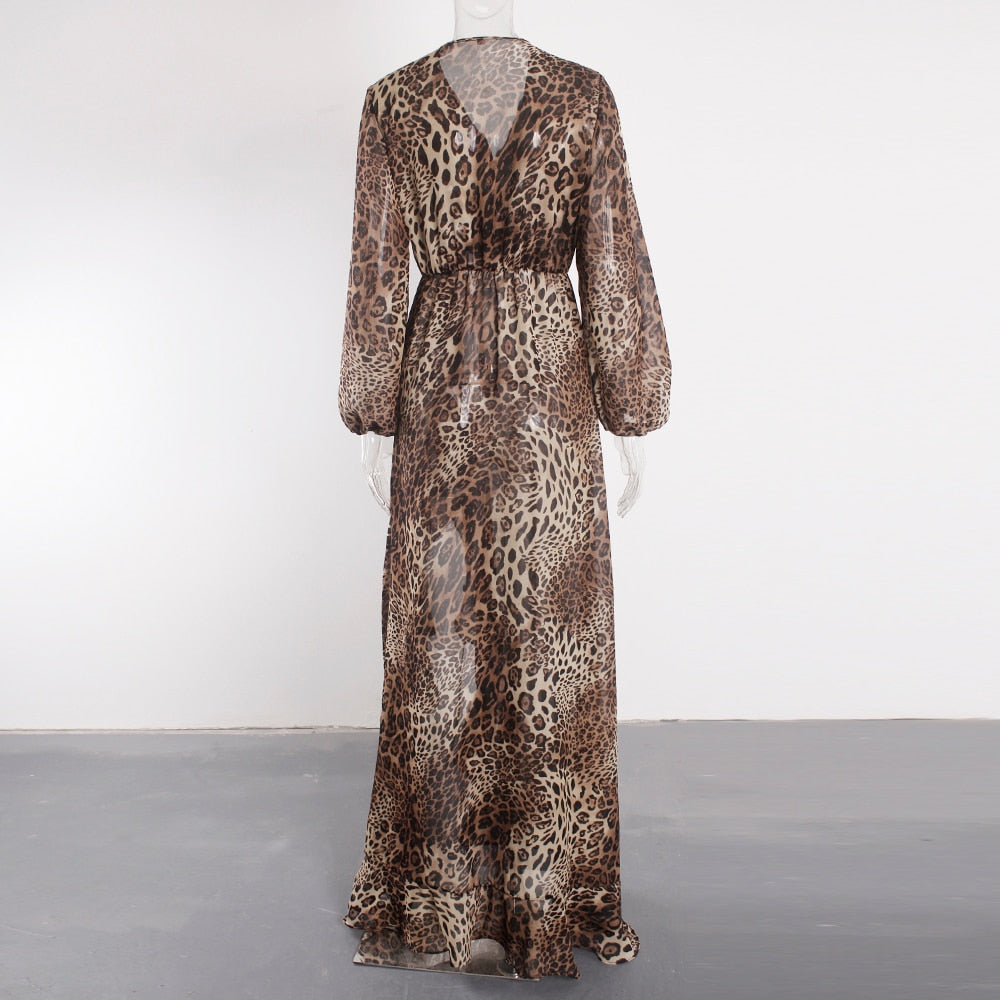 Leopard Patterned Chiffon Long Dress with High Slit and Lantern Sleeve