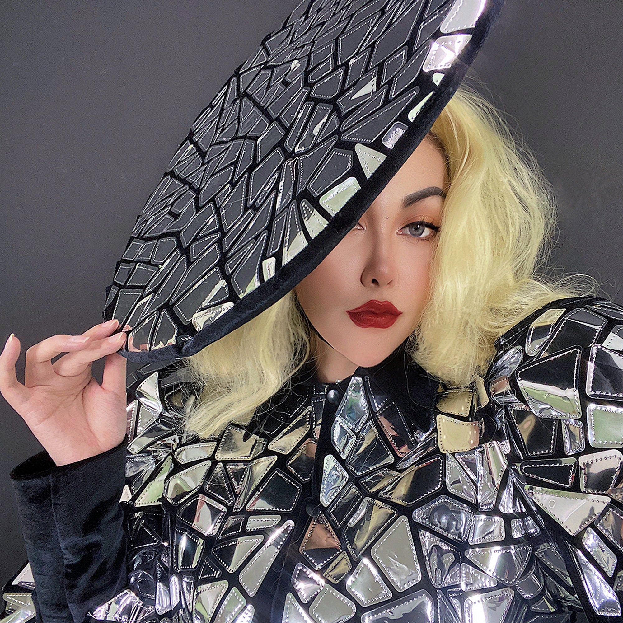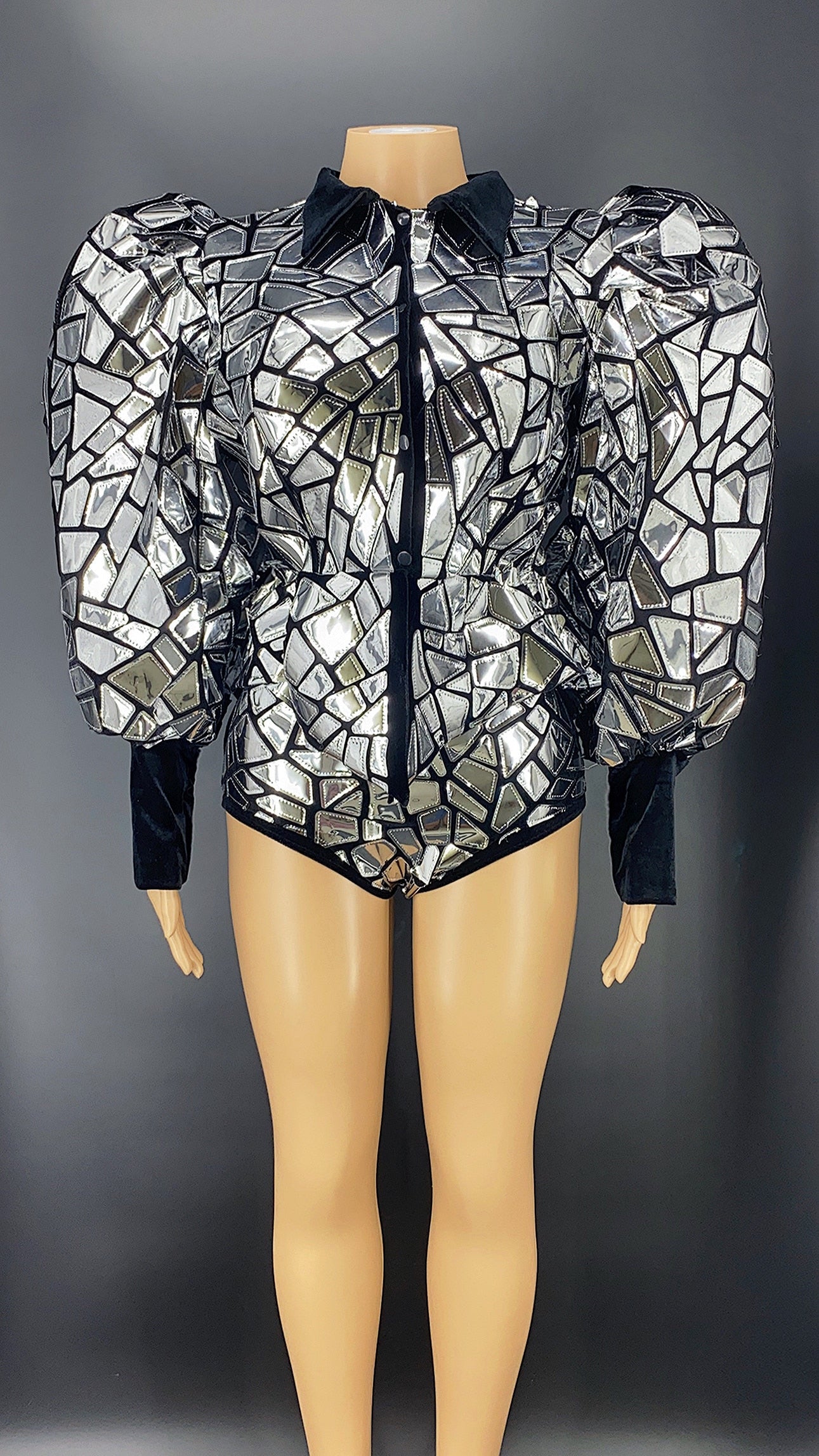This unique bodysuit is ensured will add a touch of fun. The long puff sleeve and mosaic pattern in hologram color make it perfect for stage performance. The turn-down collar and zipper closure at the front give it classic look.