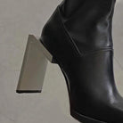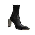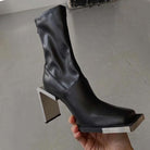 These black ankle boots have a split leather toe, a square toe, and a zipper on the back. They're a solid black color and have a super high heels. They're perfect for everyday wear.