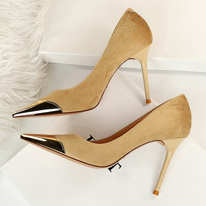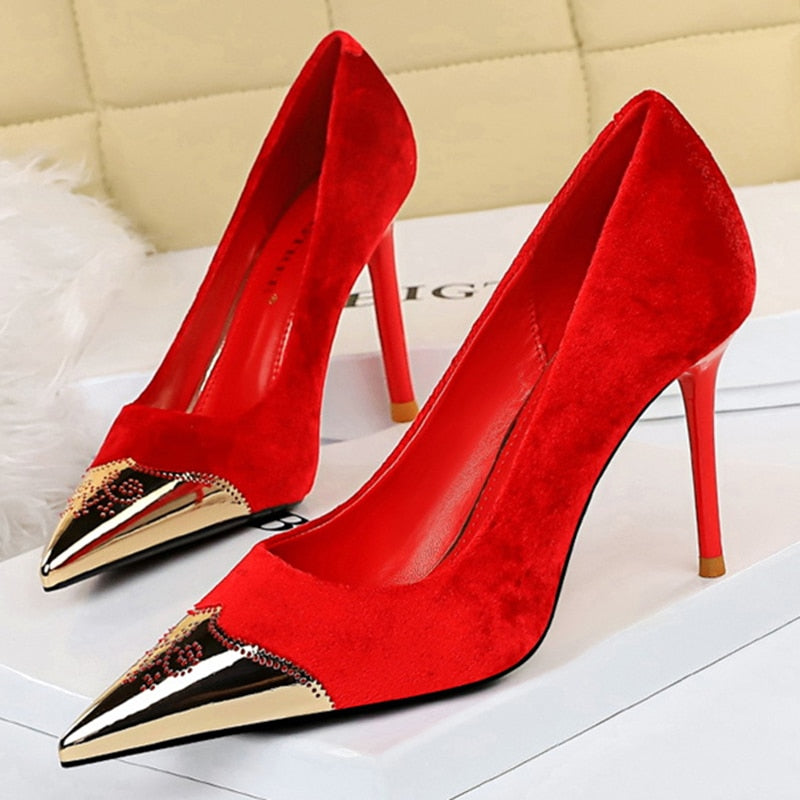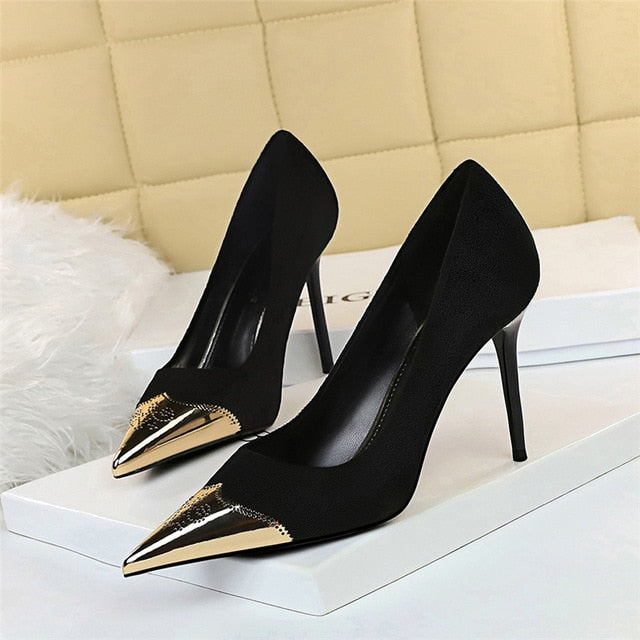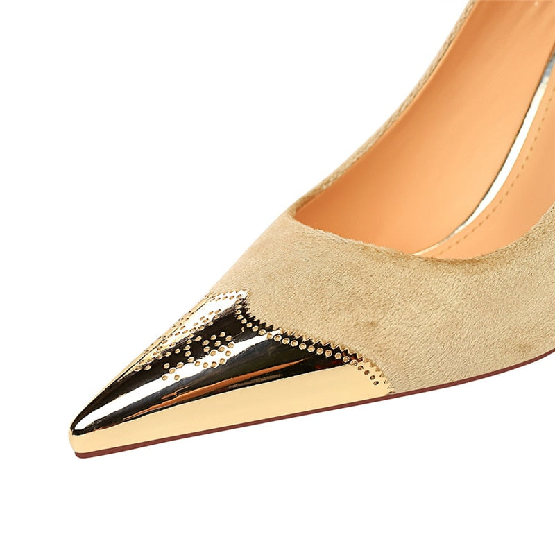 Flock PU Leather Solid Patterned with Metal Decoration Pointed Toe Stiletto