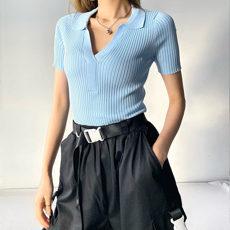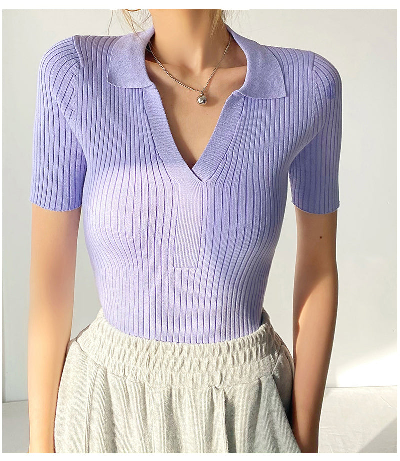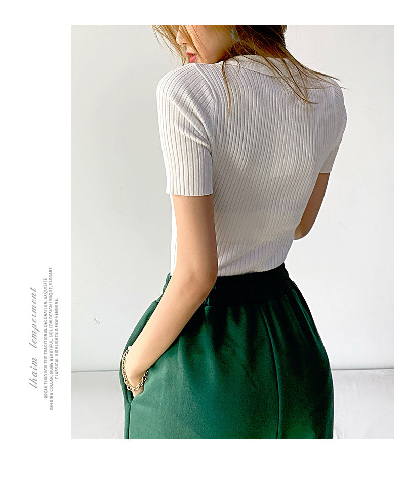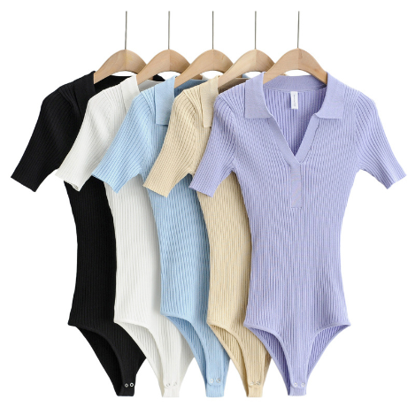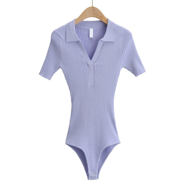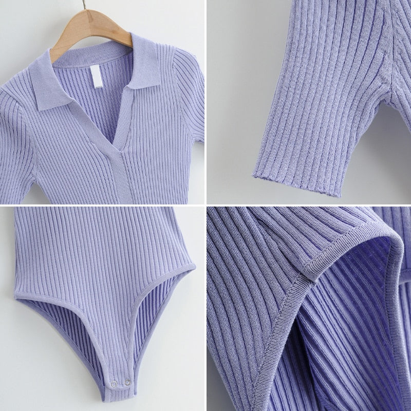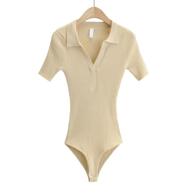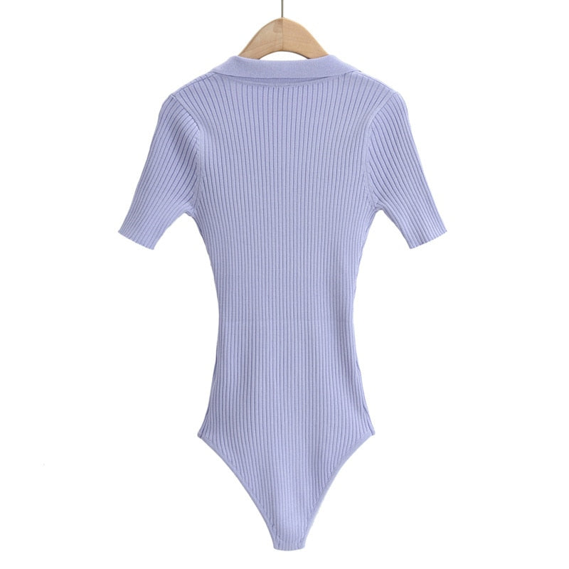 Short-Sleeved Nylon Viscose Bodysuit with Turn-Down Collar and Stripe Pattern
