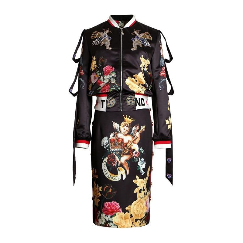 Floral Patterned Bomber Jacket and Midi Skirt Sets