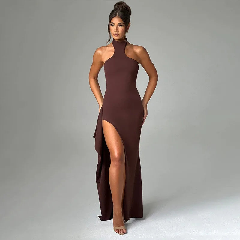 Transform your look with our Ring Ring The Bell Long Dress. The fit and flare silhouette accentuates your curves while the halter neckline adds a touch of elegance. Made with a perfect blend of polyester and spandex, this ankle-length dress is both comfortable and stylish. Perfect for a sexy and club-ready ensemble!