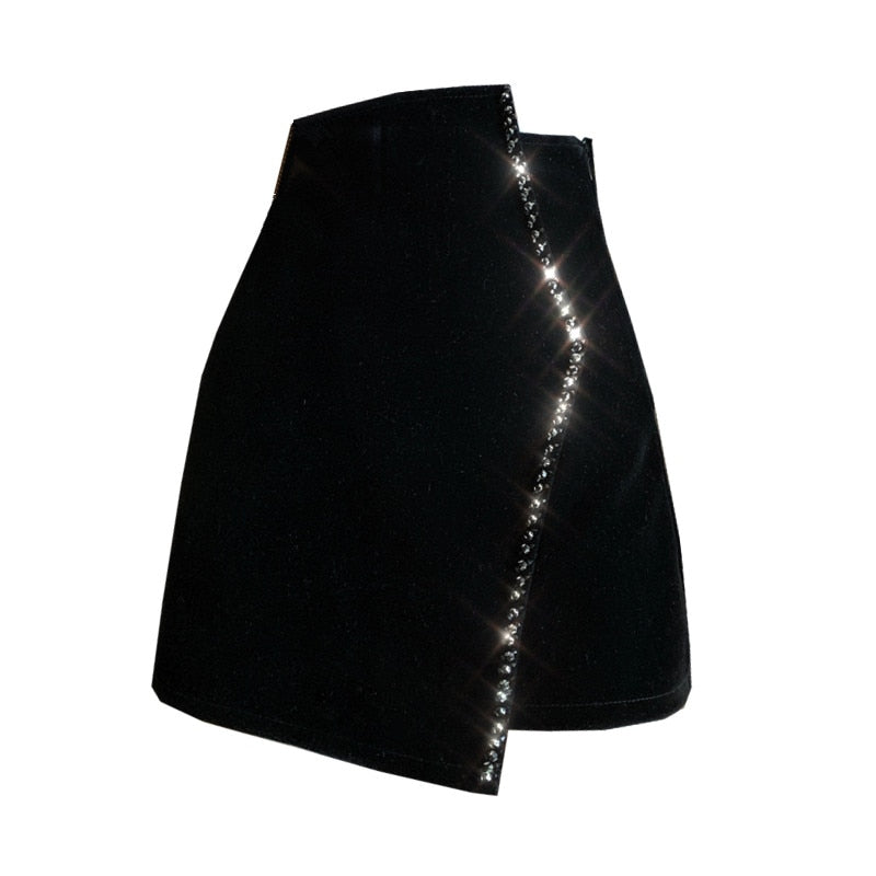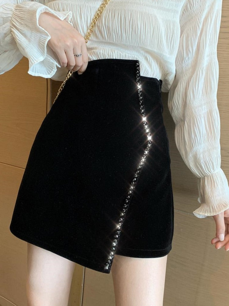 A mini skirt with a shimmery black color and rhinestone embellishments will make you feel like a glamorous star. You'll love the way these high-shine mini skirts flaunt a flowing silhouette with a trendy lace design. The lightweight fabric is perfect for warm weather, making it a summer essential.