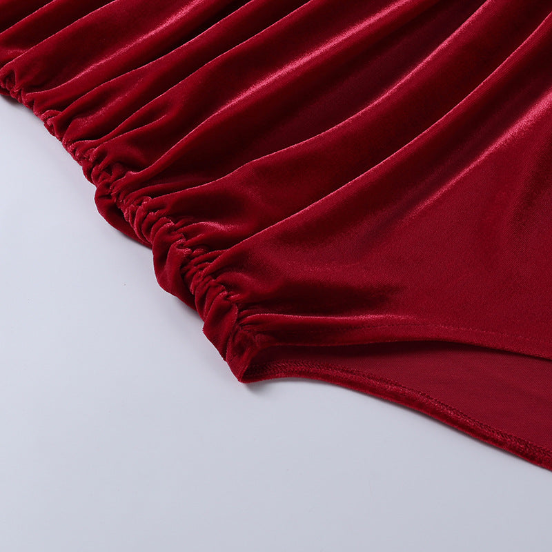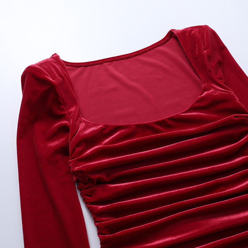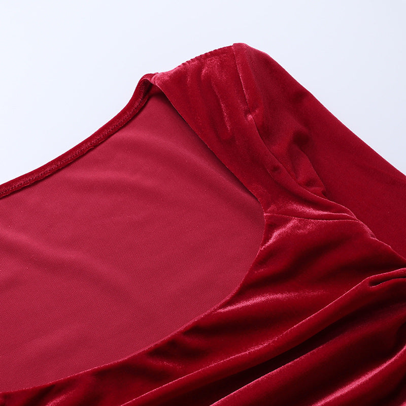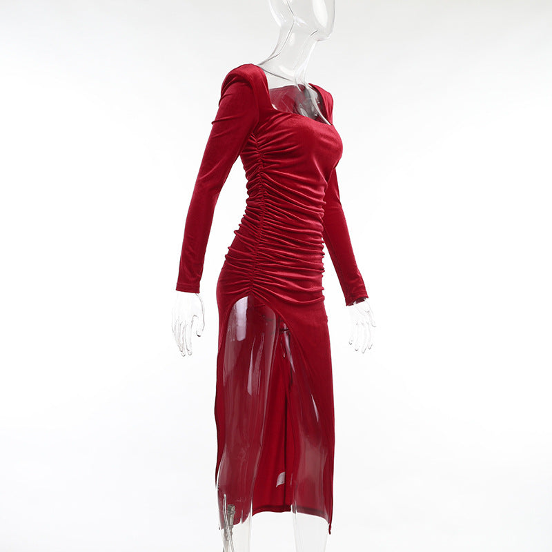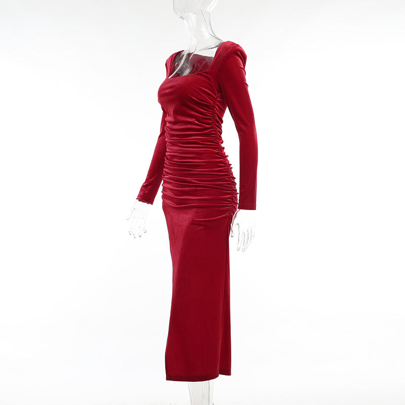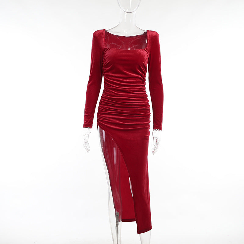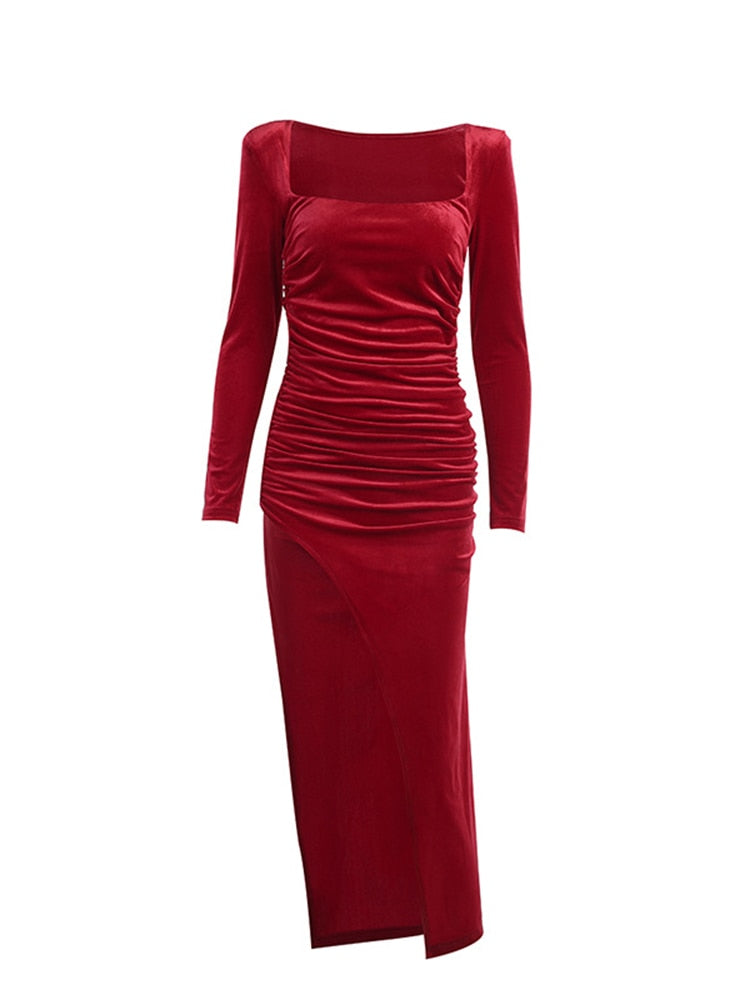This dress is crafted from a soft cotton velvet material. A chic and stylish mid-calf dress that can be dressed up or down depending on your style. The classic square neckline style is a versatile choice that looks fantastic. The side ruched with the high slit gives this dress a feminine touch that is sure to get noticed.