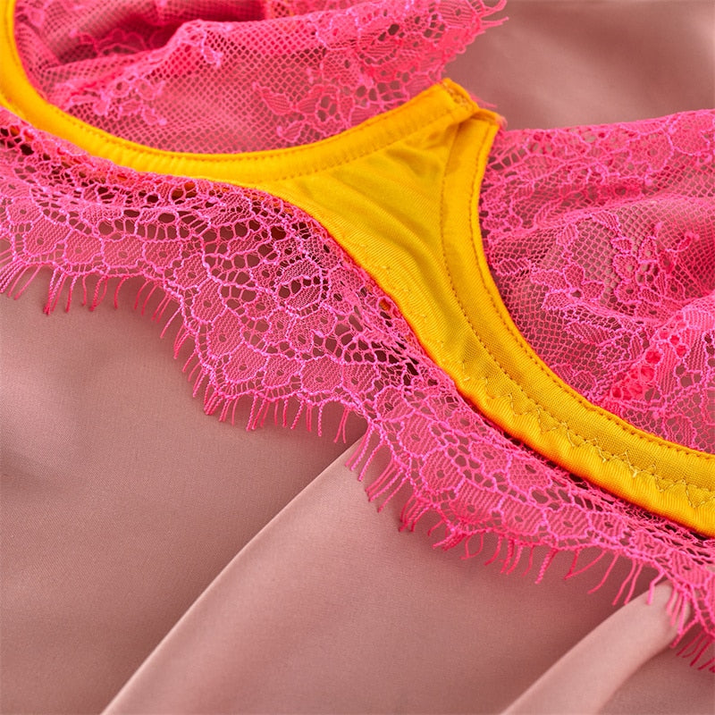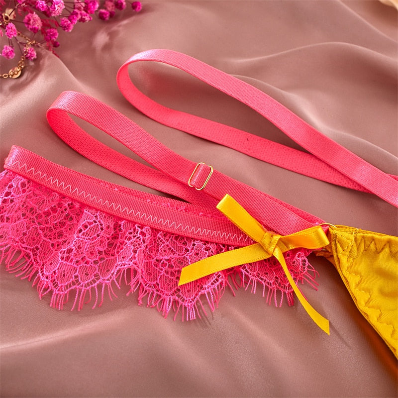 Be ready to steal the show with this sexy, seductive, and alluring set. The seductive, sensual look of this set will have you feeling sexy and ready to play. The delicate and feminine lace with a hint of pink color makes it a sexy choice for any woman.