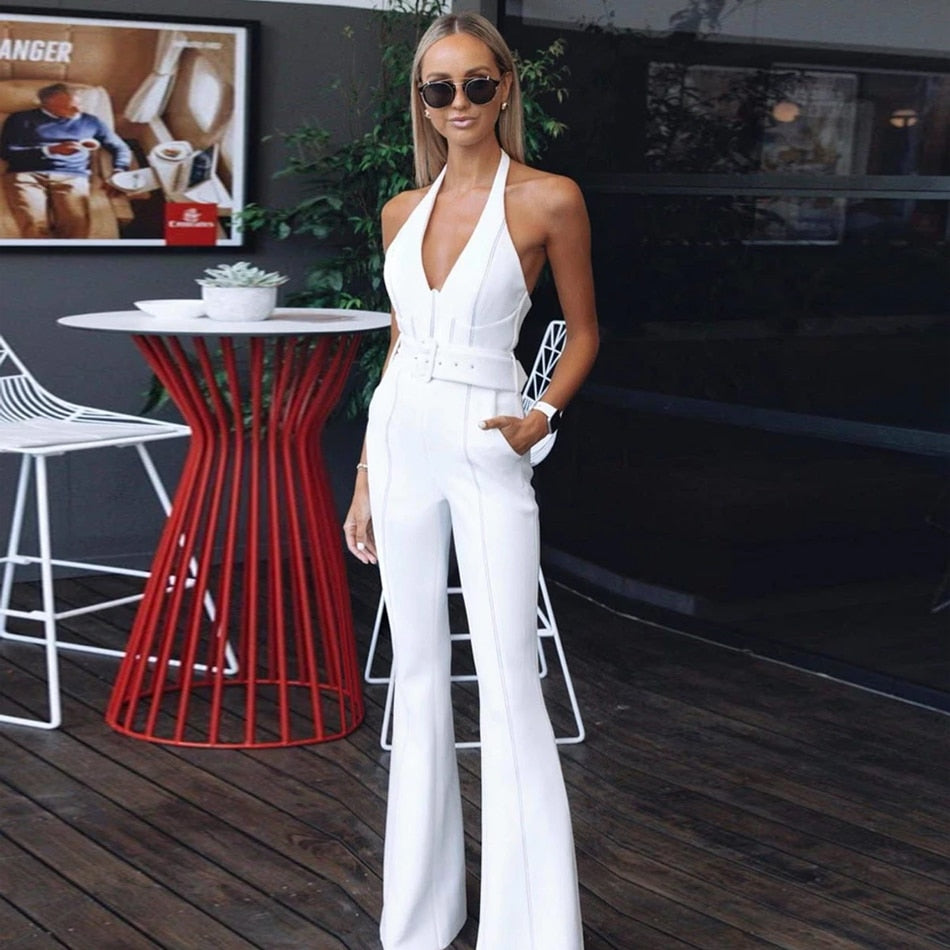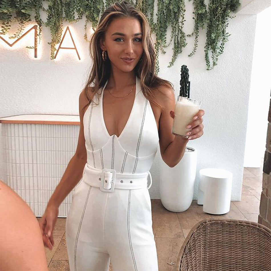 If you're looking for a chic outfit that is comfortable enough to wear all day, this jumpsuit is for you. Made of polyester, this jumpsuit features a halter neck, sleeveless design, and a striped pattern. The white color will go with just about anything in your closet.