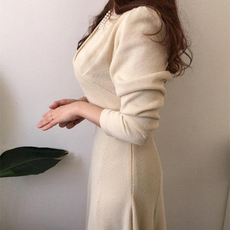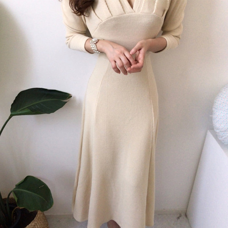Simple Casual Dress V-Neck Long Sleeve Elastic Slim