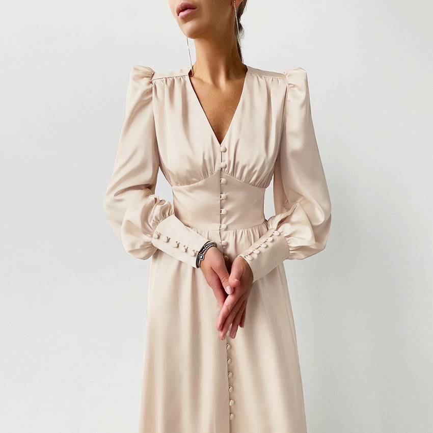 Vintage Empire Waist Maxi Dress with Lantern Sleeve, V-Neckline, and Polyester Spandex Material