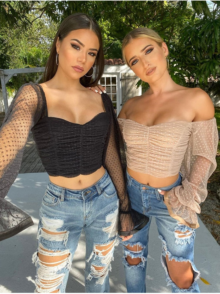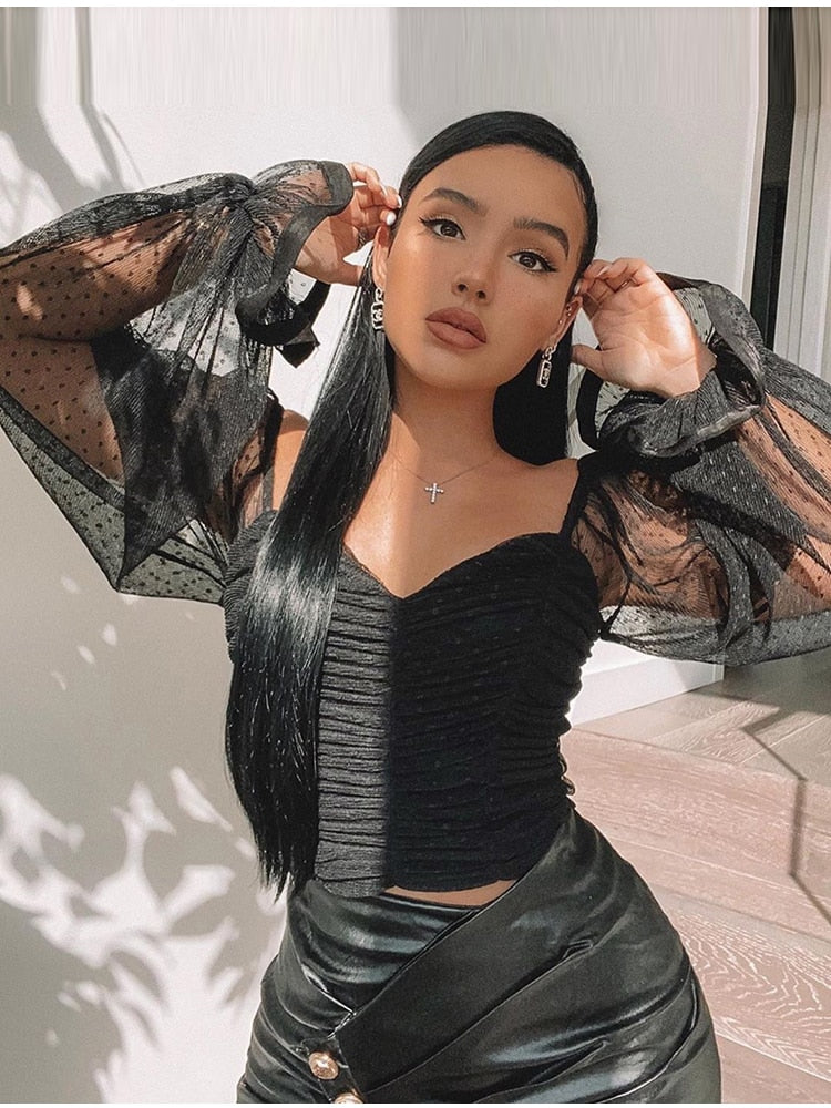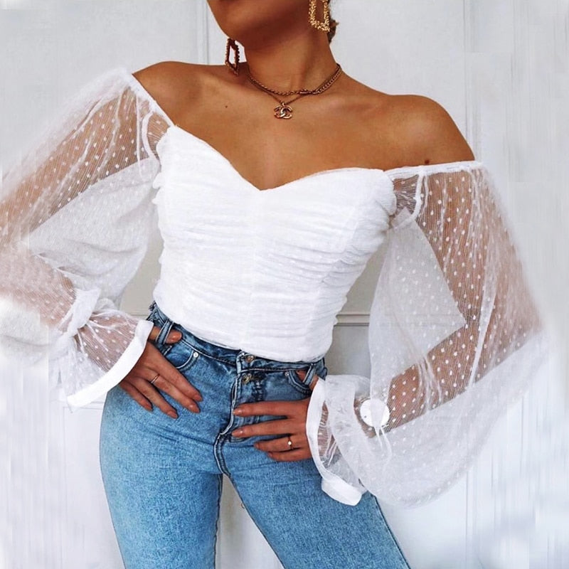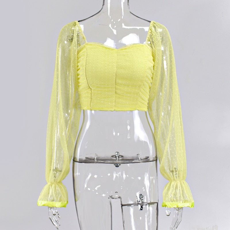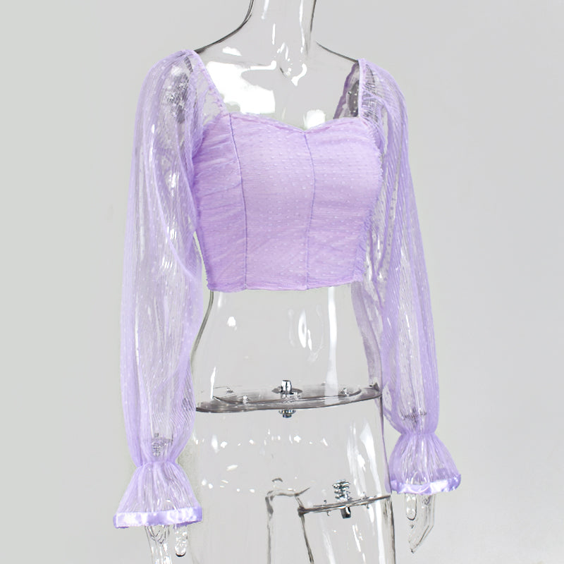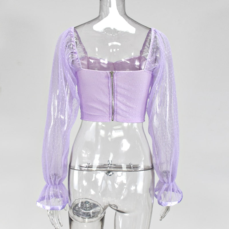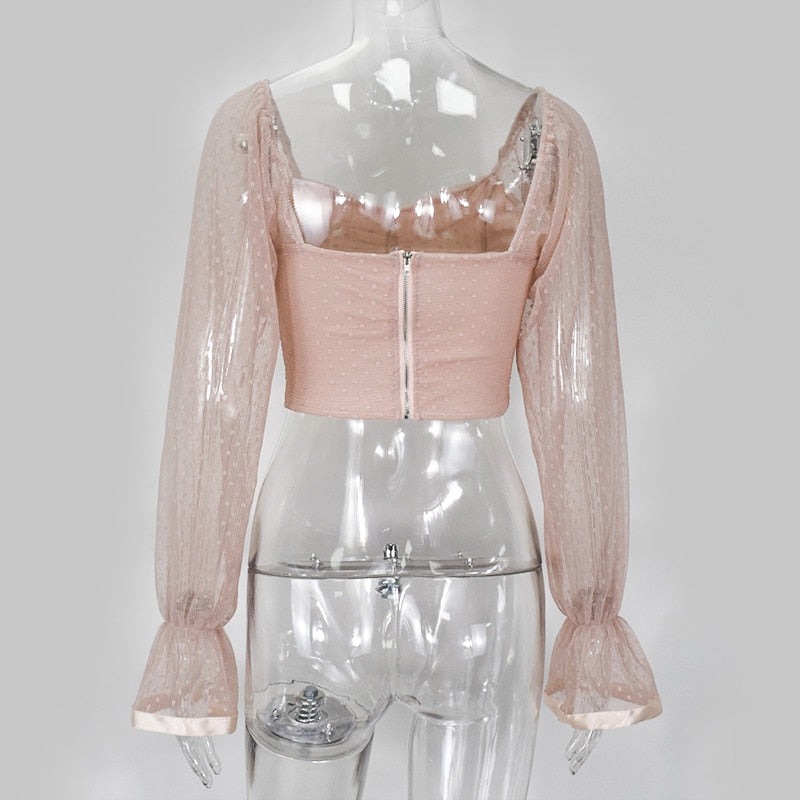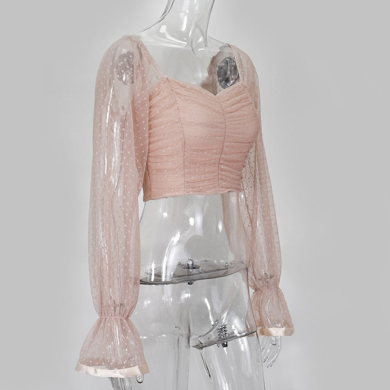Vintage Pink Sweetheart Neckline Polka Dot Lantern Sleeve Women Ruched Blouse