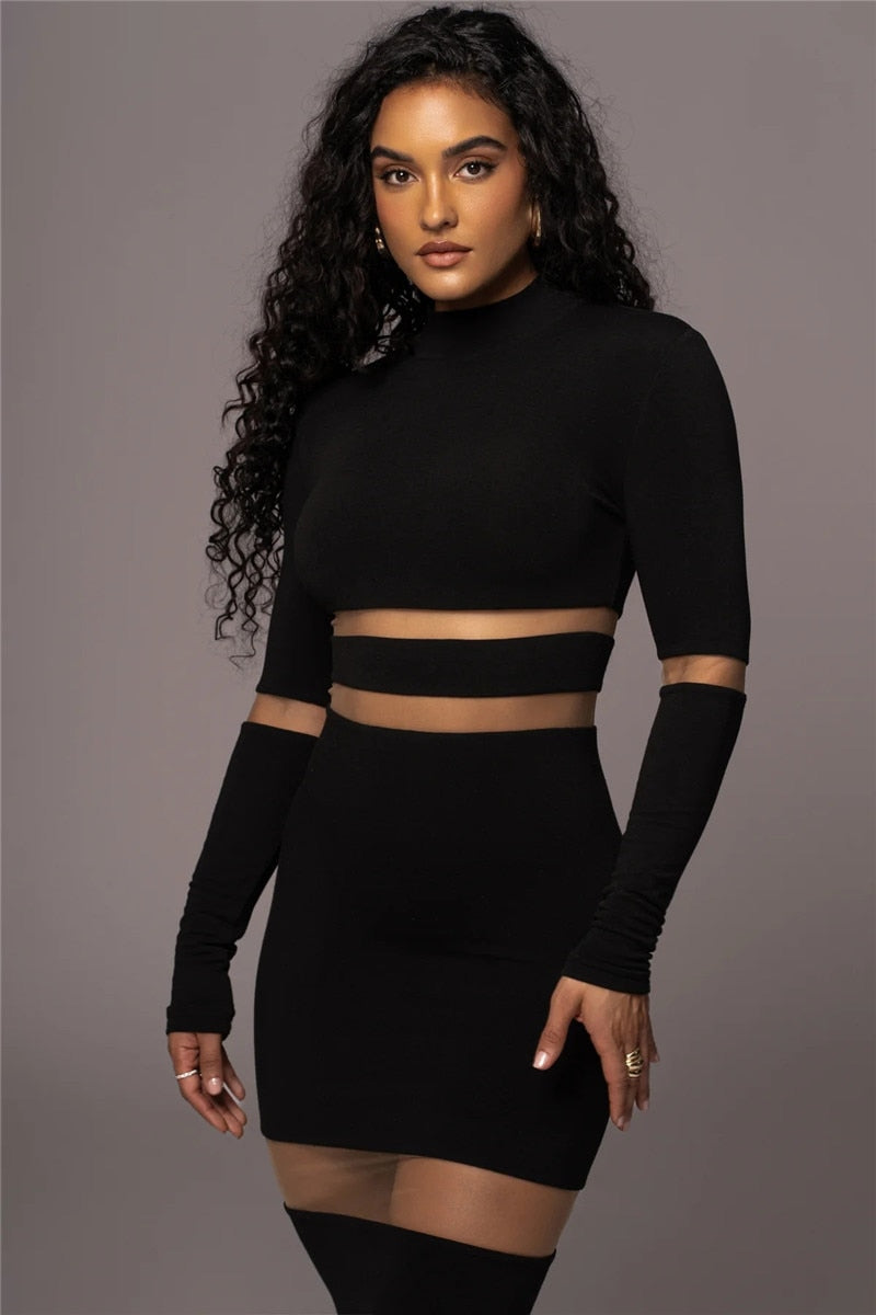 This midi dress is the perfect choice for an elegant yet edgy look. Constructed with solid fabric and detailed with a see-through mesh patchwork, this dress features long sleeves and a midi length for a classy and sophisticated finish.