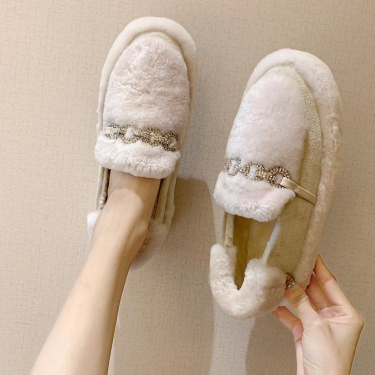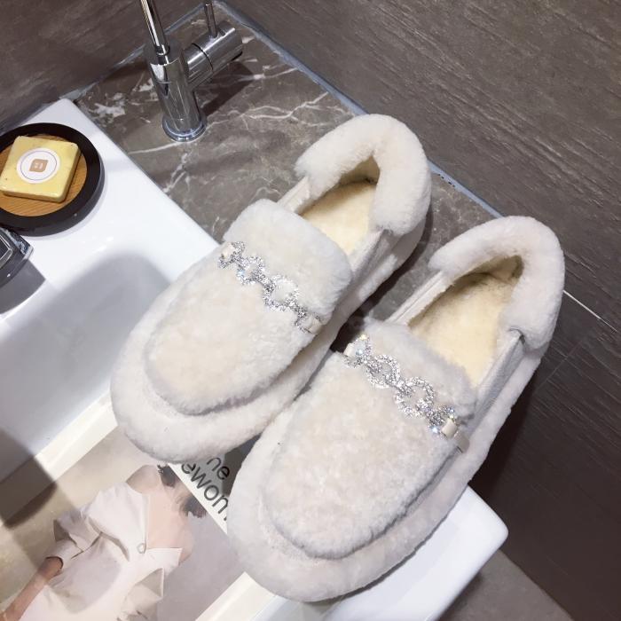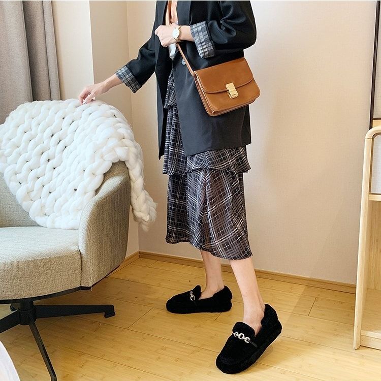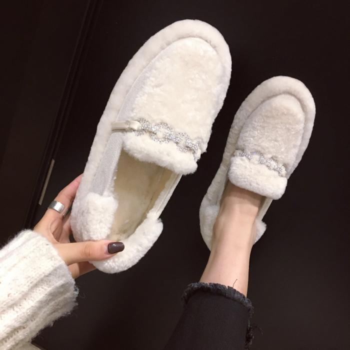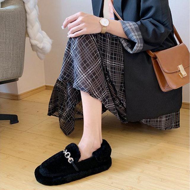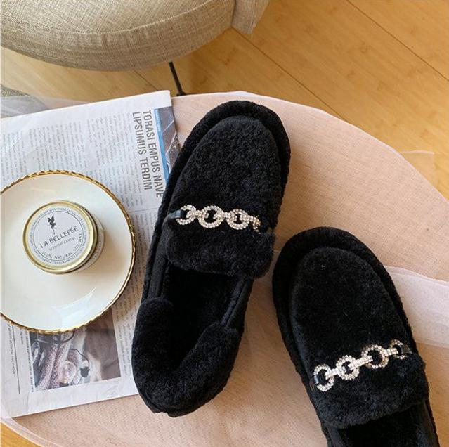 Round Toe Solid Color Loafers Shoes with Chain Decoration, Rubber and Faux Fur Lining Material
