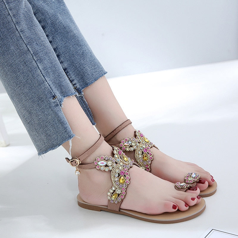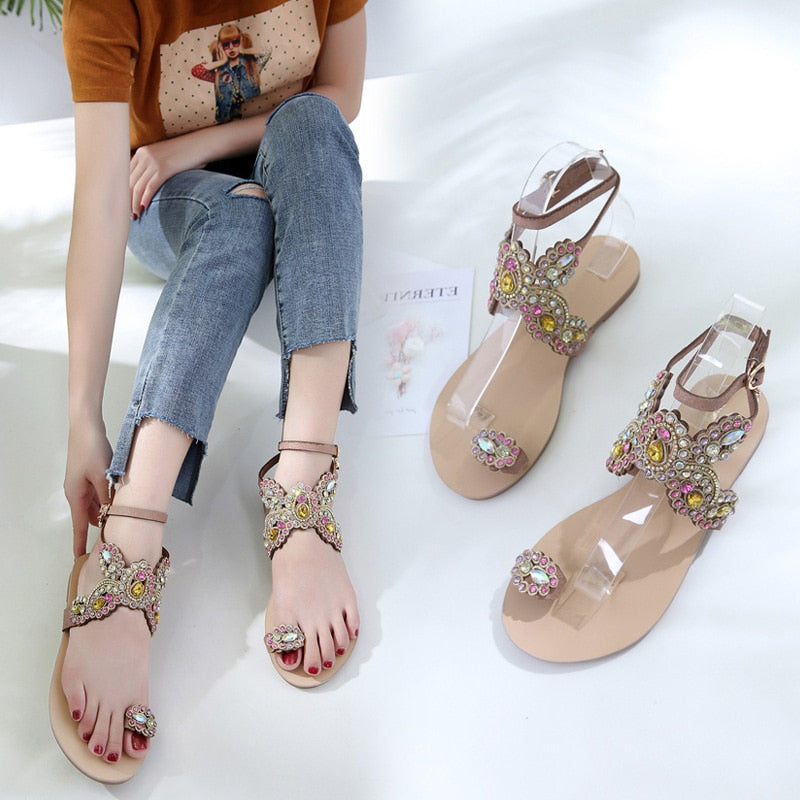 PU Leather Flat Sandal with Rhinestone Decoration on the Butterfly Style Strap