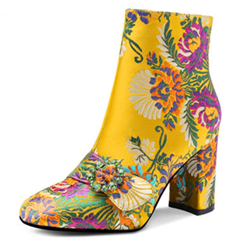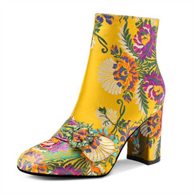 Square Toe Ankle Boots with Floral Pattern, Zipper Closure, and Silk Upper Material