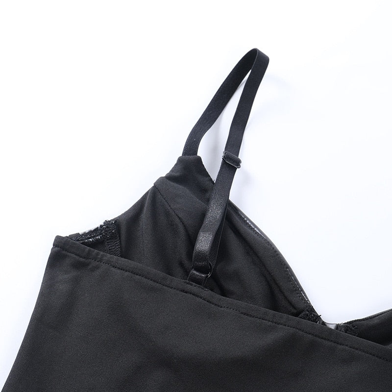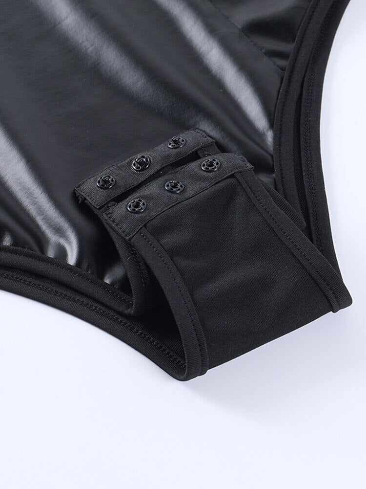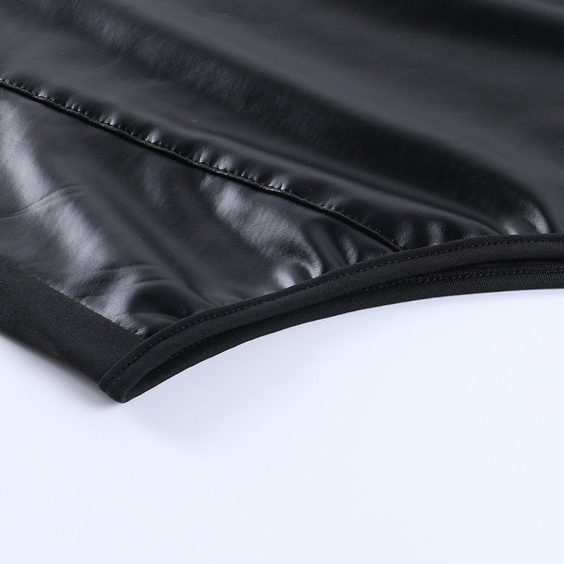 For an effortlessly chic look, try this women's leather bodysuit. The solid black color adds a bold accent to any outfit and the spaghetti straps are sexy and flirty. The fitted bodysuit is designed to hug your curves so you can feel confident and comfortable all day.