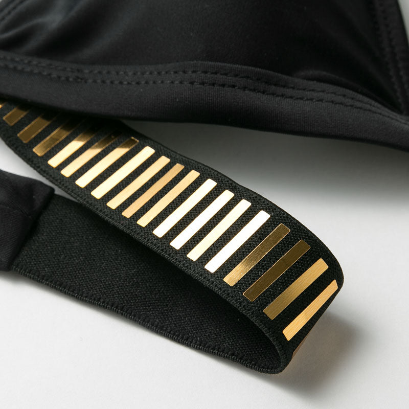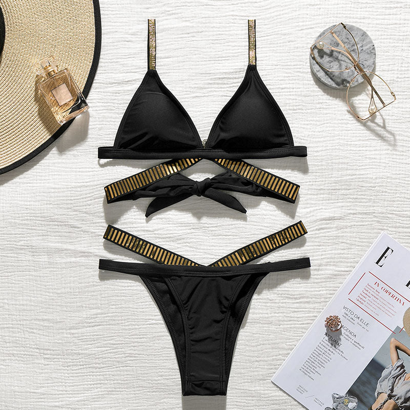 With a chic, minimalist aesthetic, this two-piece bikini is the perfect addition to your wardrobe. The black, solid-colored fabric features a strap decoration in a golden stripe pattern that is sure to complement any beach day look.