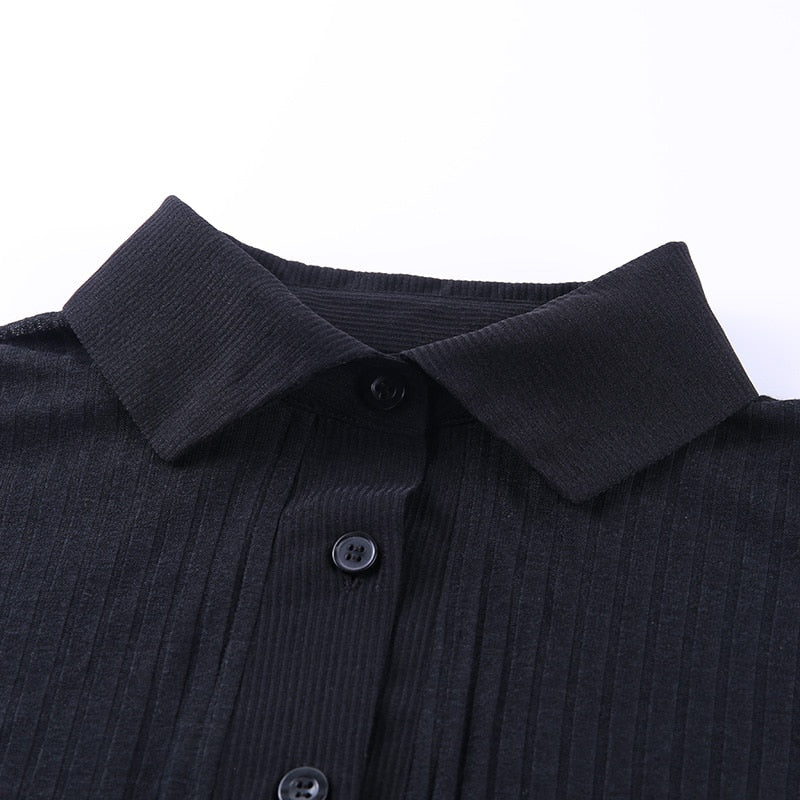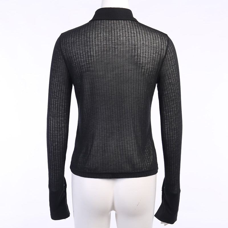 See-Through Long-Sleeved Shirt with Turn-Down Collar and Polyester Material
