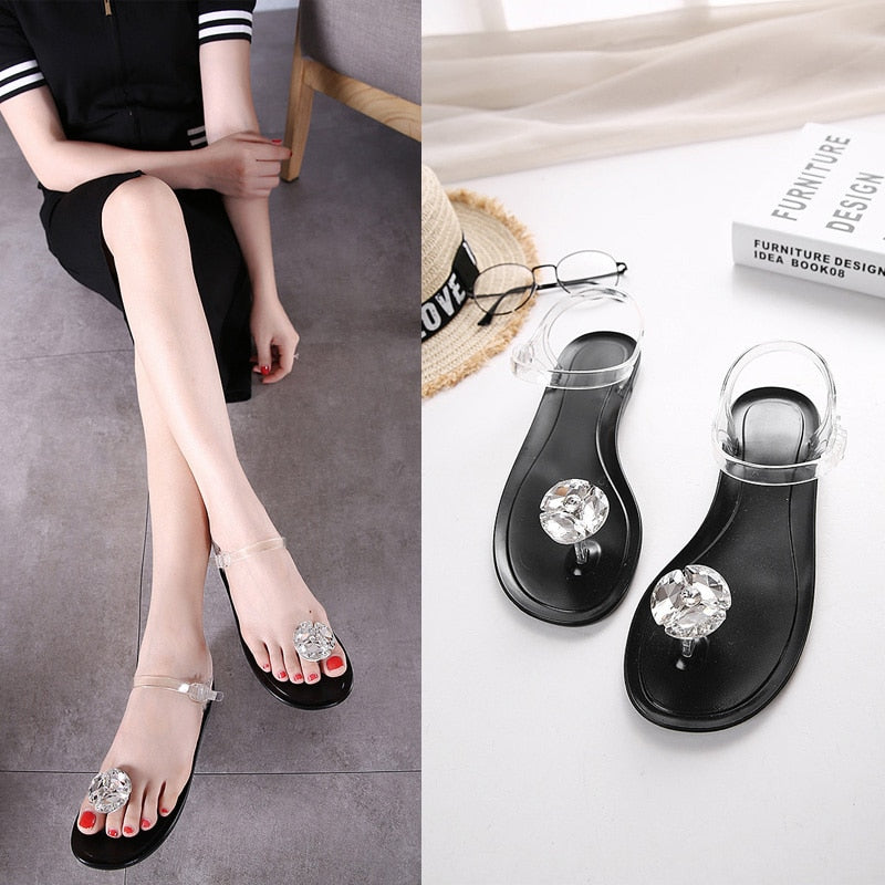 Transparent Ankle Strapped Neoprene Flat Sandal with Gemstones Decoration