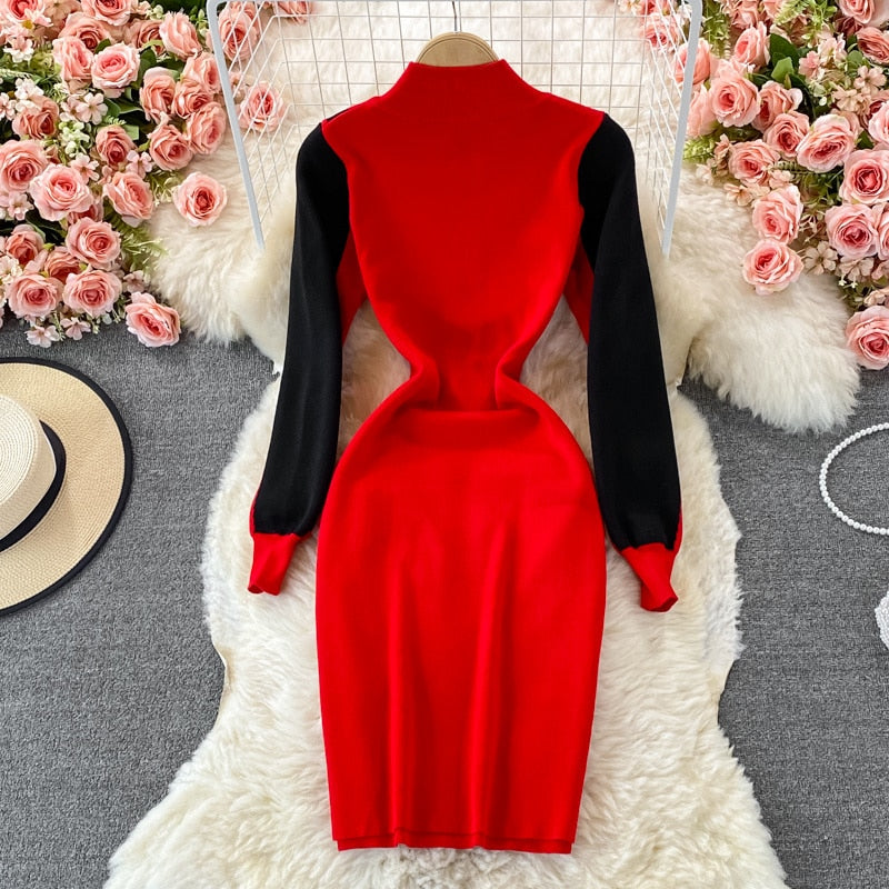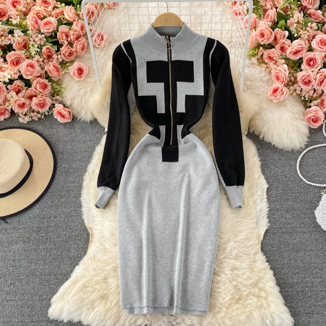 Long-Sleeved Turtleneck Mini Dress with Zipper Closure made from Polyester Material