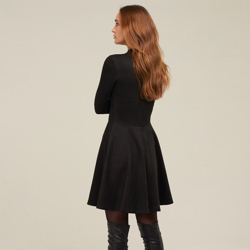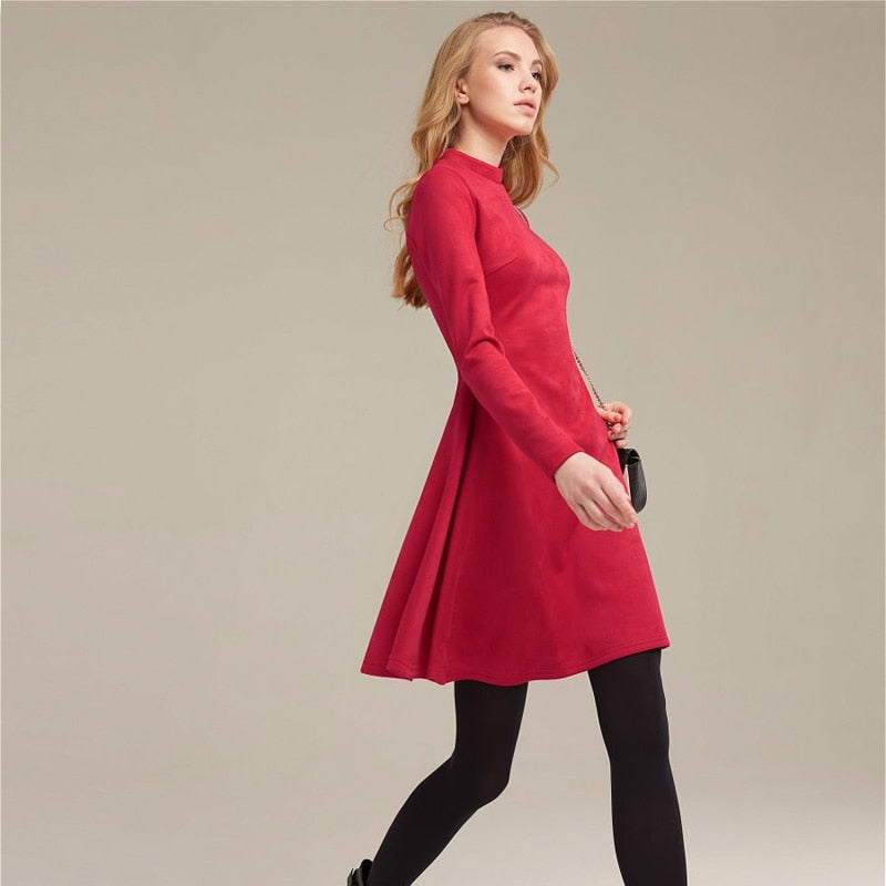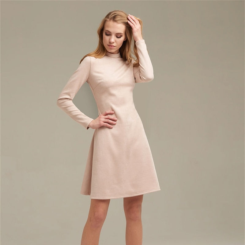 Long Sleeve Solid Mini Dress with O-Neck Collar, A-Line Silhouette, and Velvet Material
