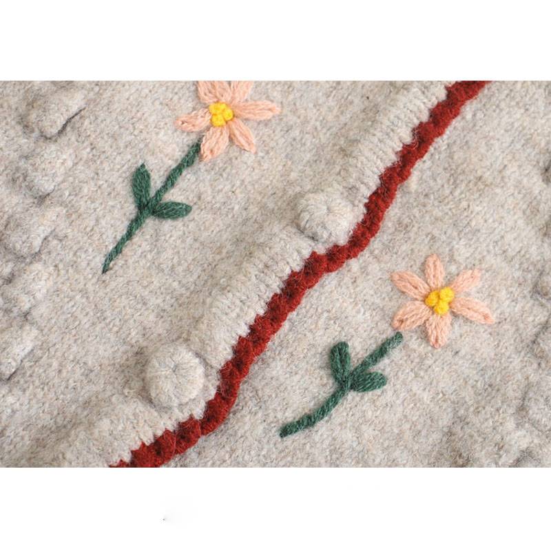 Single-Breasted Closure Sweater with Flower Embroidery, Ruffle Decoration, V-Neck Collar, and Polyester Material