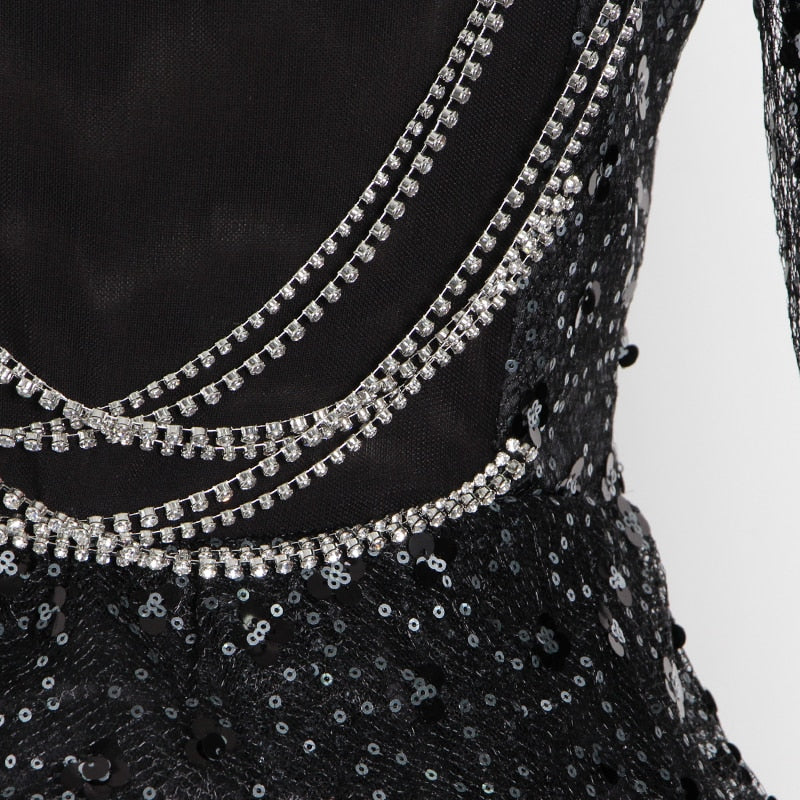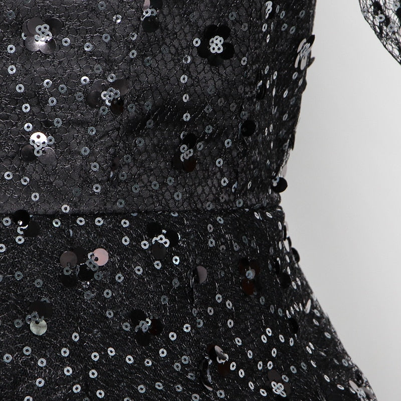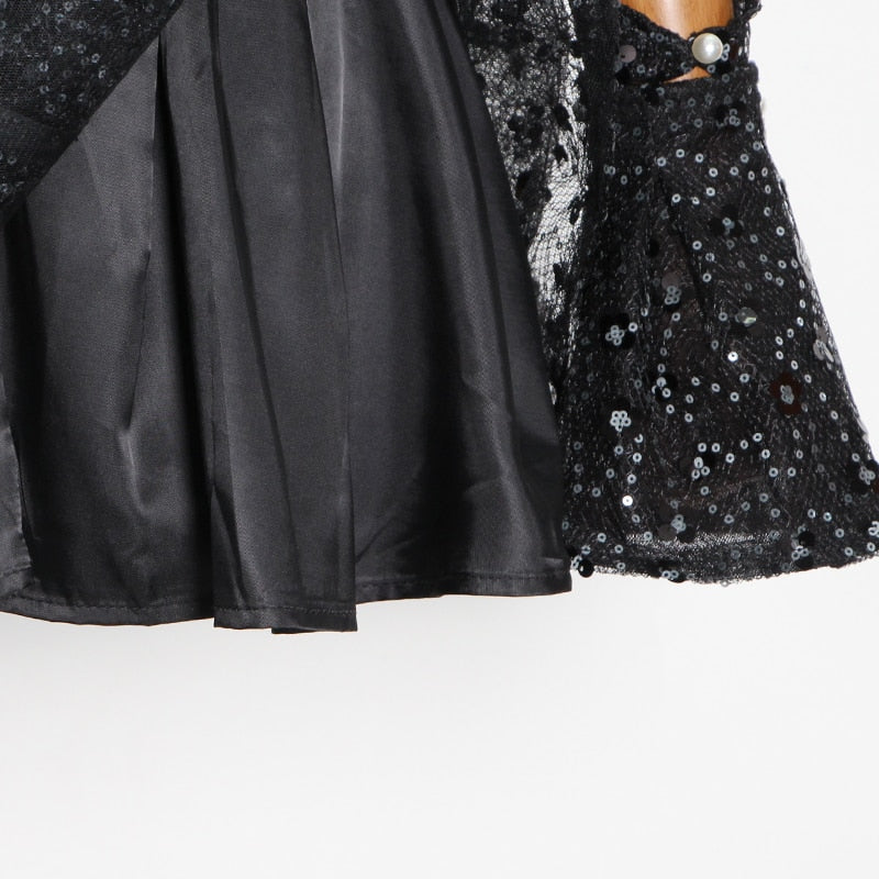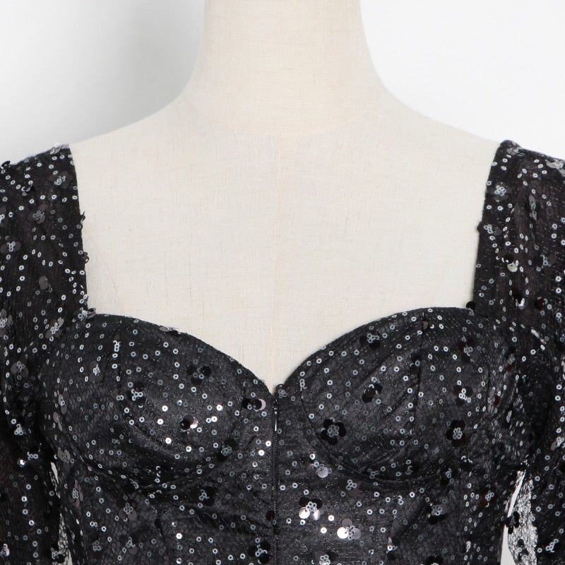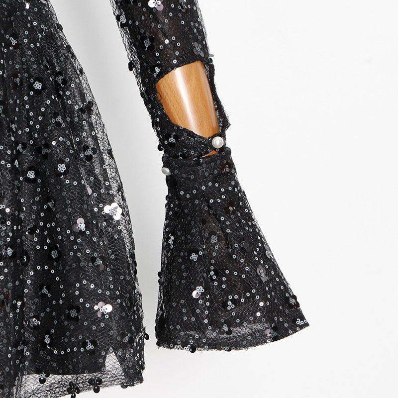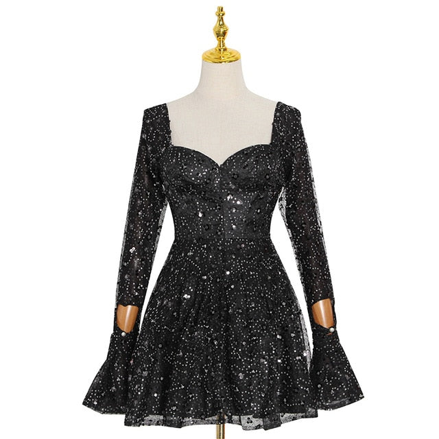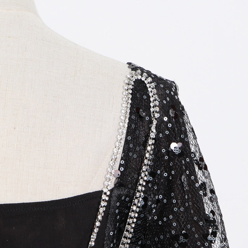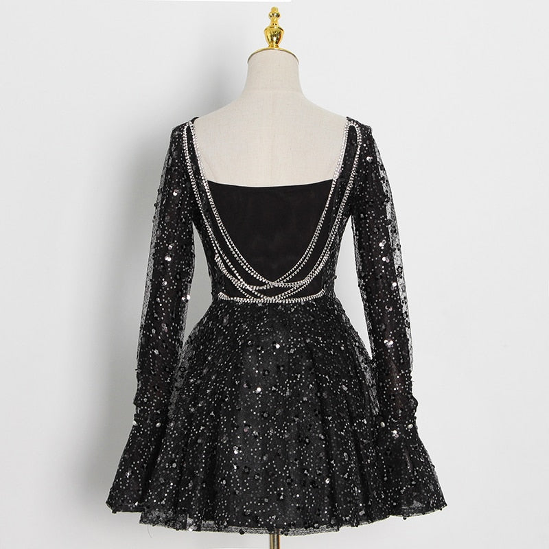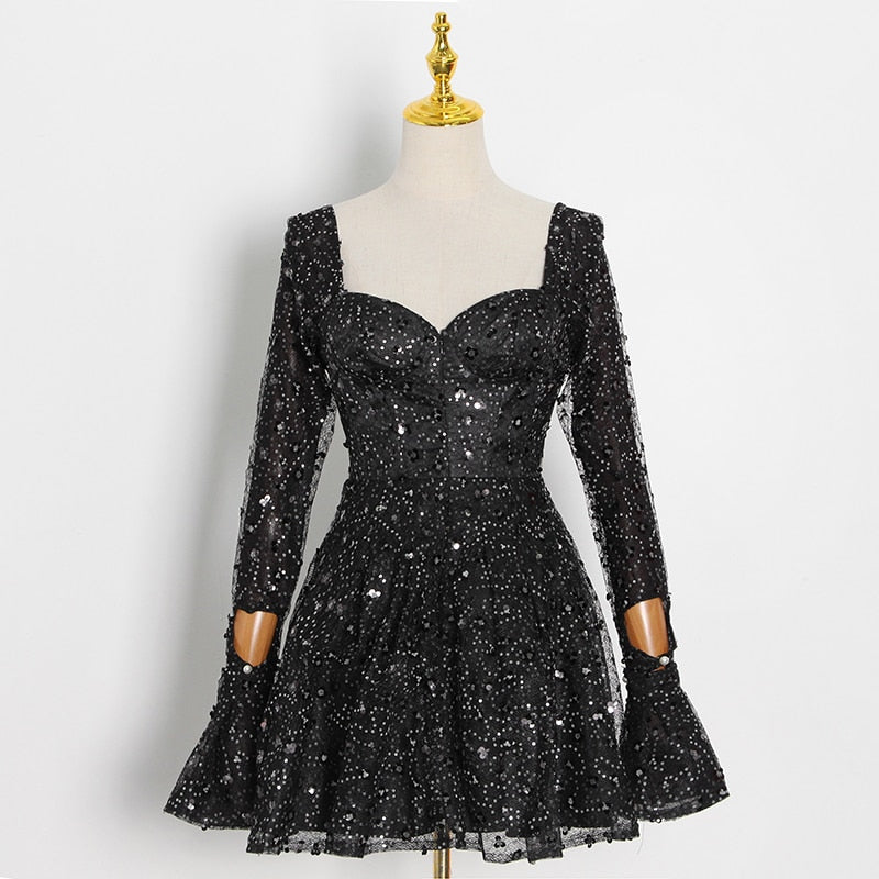 Square Neck Black Mini Dress with Sequin Decoration, Flare Sleeve, and Cotton Polyester Material