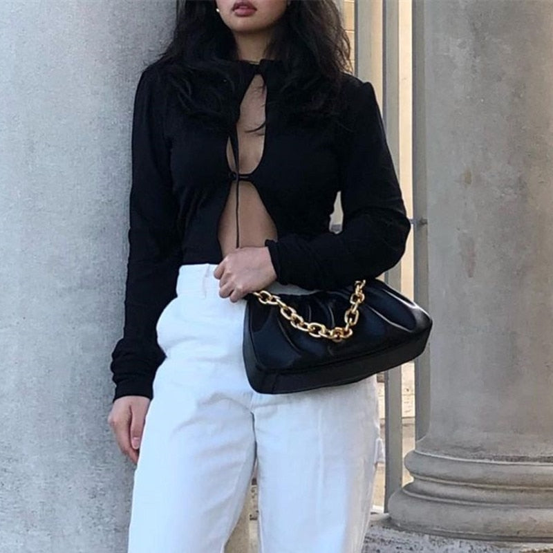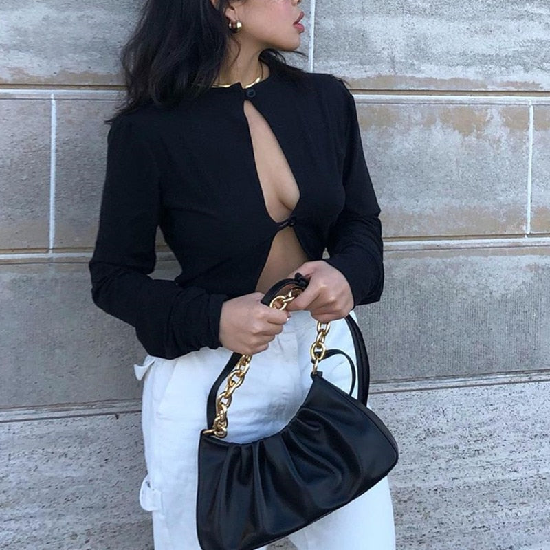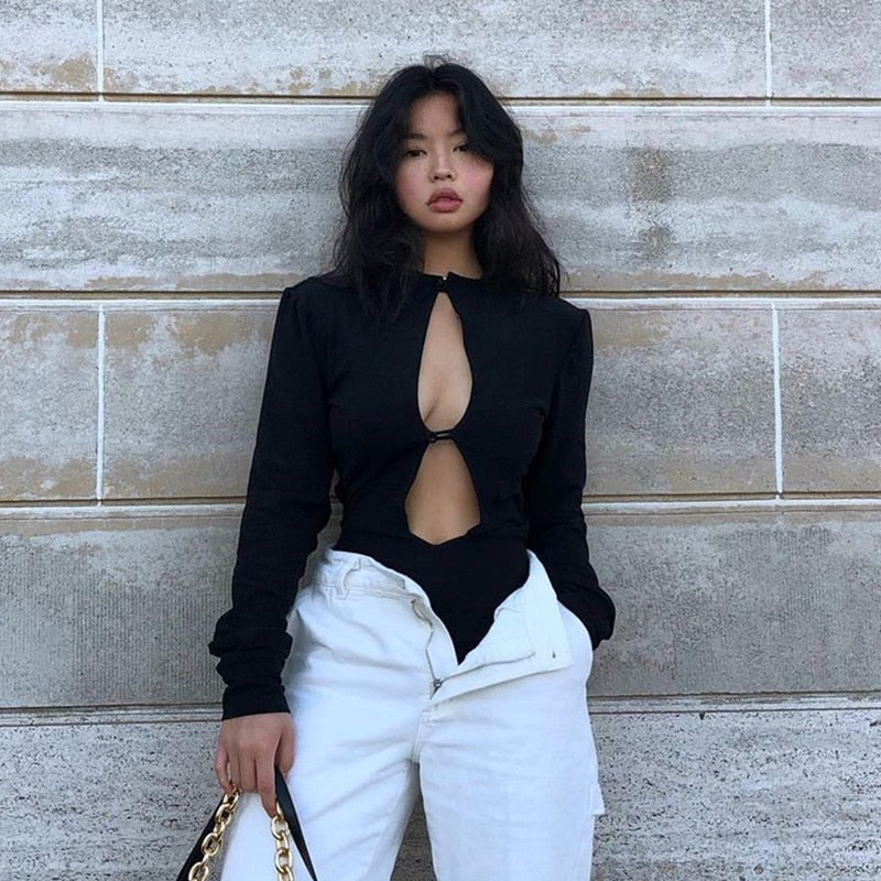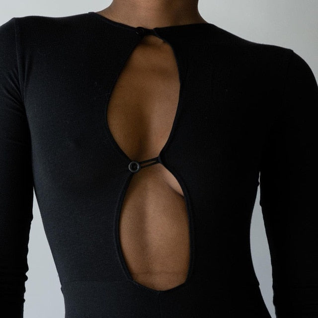 Long-Sleeved Bodysuit with Front Hollow Out and Polyester Spandex Material