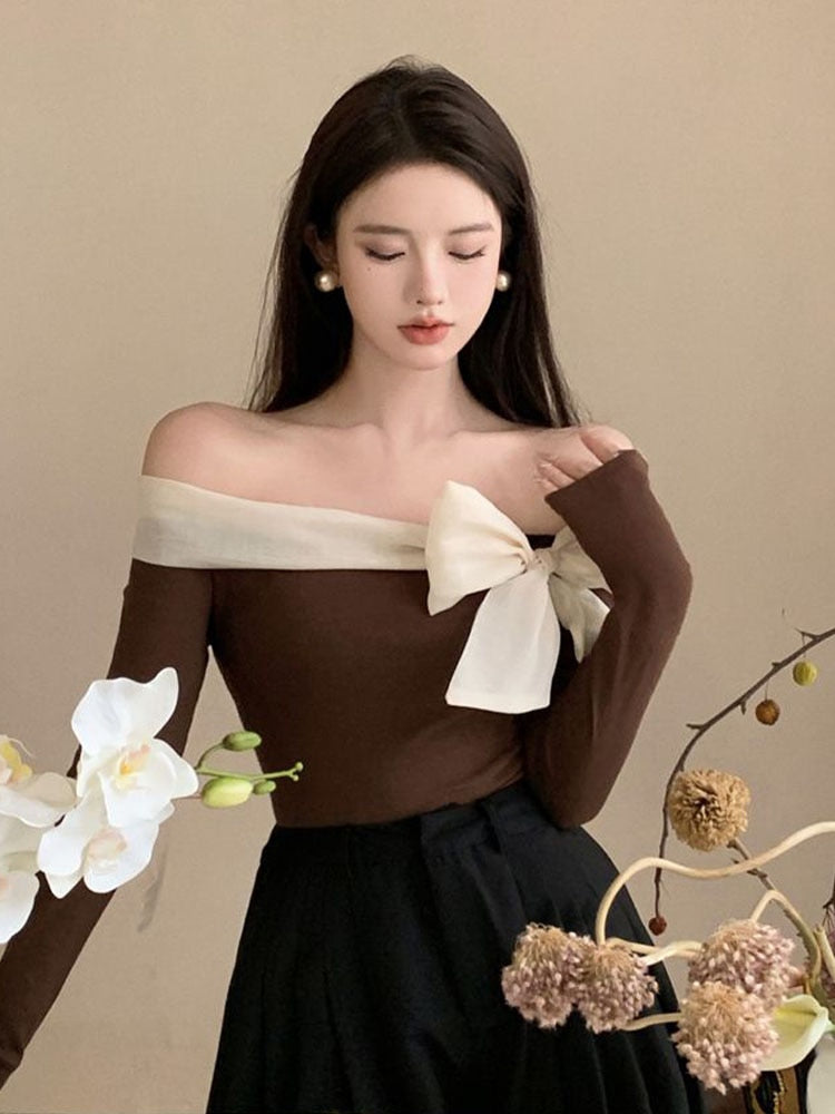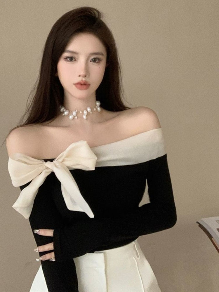 This off-shouldered blouse boasts a slash-style band neckline, accented in a contrast hue and punctuated with a grand bow. Its long sleeves make it appropriate for many events. Elevate any look with this beautiful blouse. It’s designed with comfort and style in mind and is sure to be a timeless item in any wardrobe.