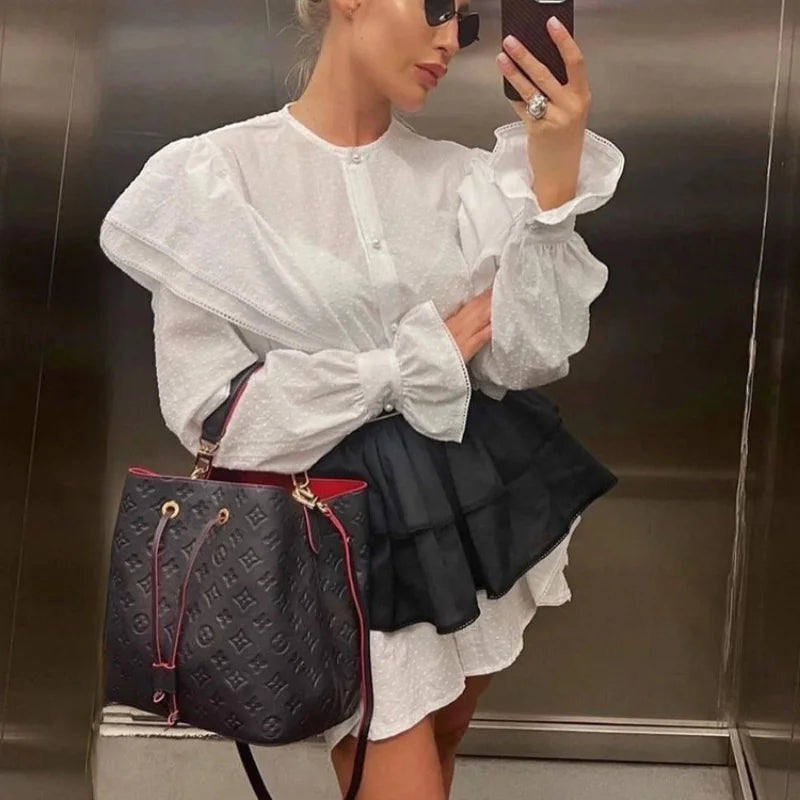 L :   Bust:108CM     Waist:72CM    Shoulder:36CM     Skirt Length:31CM       Sleeve:67CM      Top Length:82CM