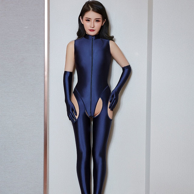 This set includes a bodysuit, pants, and gloves. The bodysuit comes in a sleeveless style with front zipper closure. The pant has hollow-out and low waist style and the gloves will complete your look.