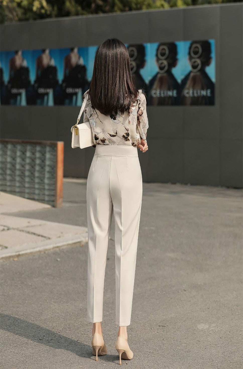 This silk pair of pants is the perfect way to add a professional touch to an exceptional outfit. The high waist ensures a slimming silhouette that accentuates slim figures. These pants are a must-have for the office and can be worn with a variety of tops.