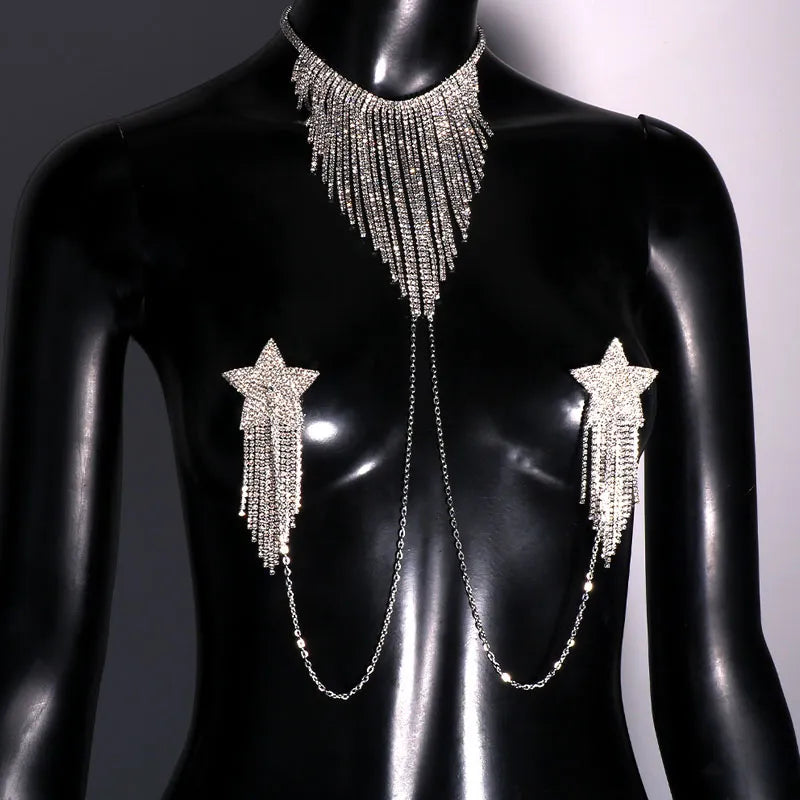 Indulge in luxurious body adornment with our Kiss It Better Body Jewelry. Made from exquisite copper, this breast patch features stunning rhinestones and a delicate tassel, creating a chic and sophisticated look. Elevate your style with this geometric design, giving you the perfect touch of elegance.