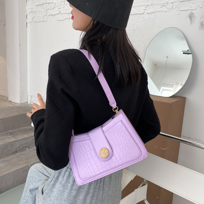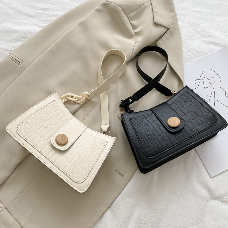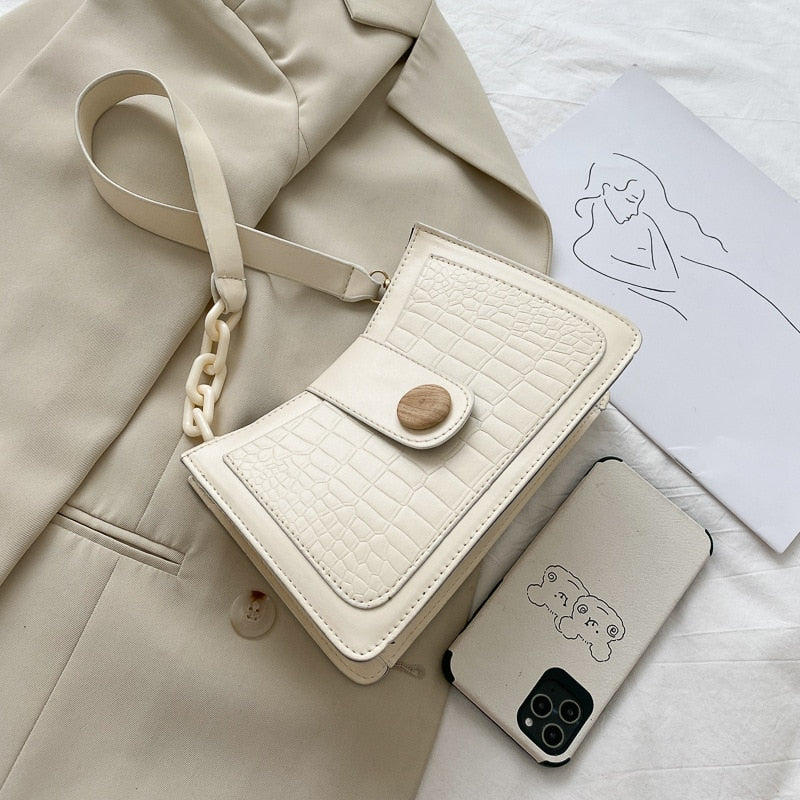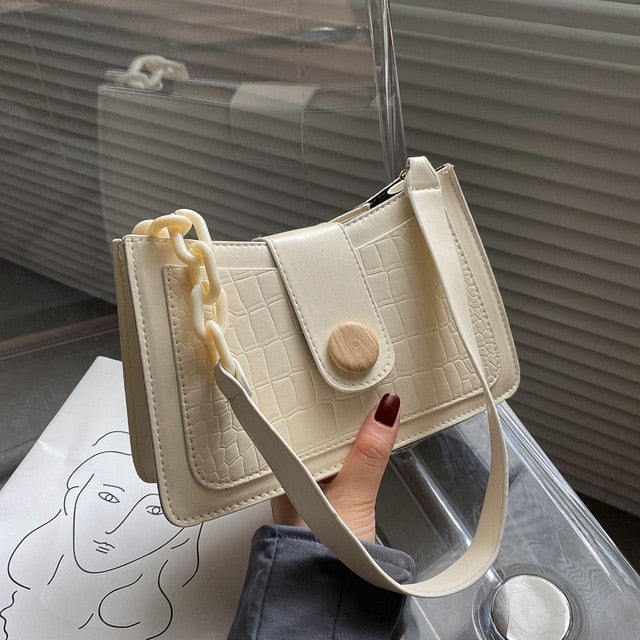 Crocodile Skin Patterned Polyester Shoulder Bag with Button and Chain Strap Style Combination
