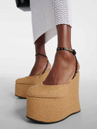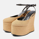 Command attention with the Spillproof Lies Wedges Sandals, featuring an open side vamp and crafted from natural cane for a bold, textured look. These daring wedges blend unique materials with standout design, perfect for those who refuse to blend in.