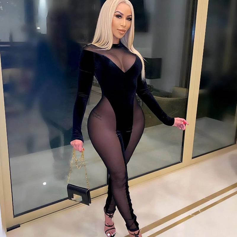 Solid Long-Sleeved Turtleneck Polyester Spandex Jumpsuit with Hollow-Out See-Through Design