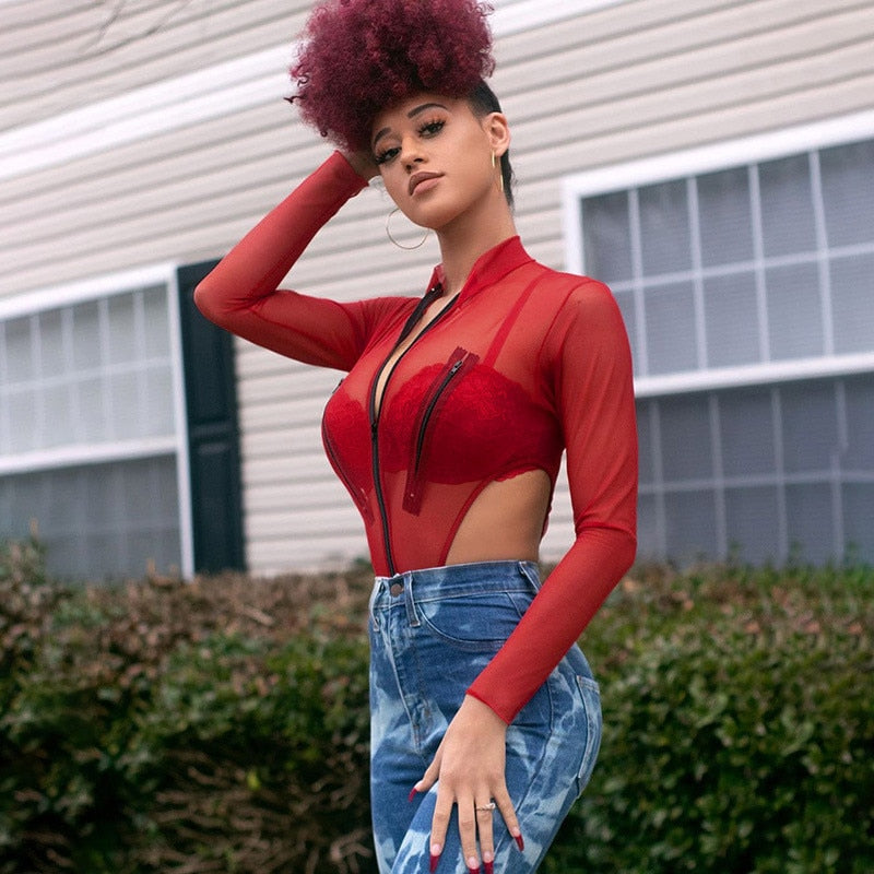 Full Sleeve See Through Bodysuit with Zipper Closure and Mesh Polyester Material
