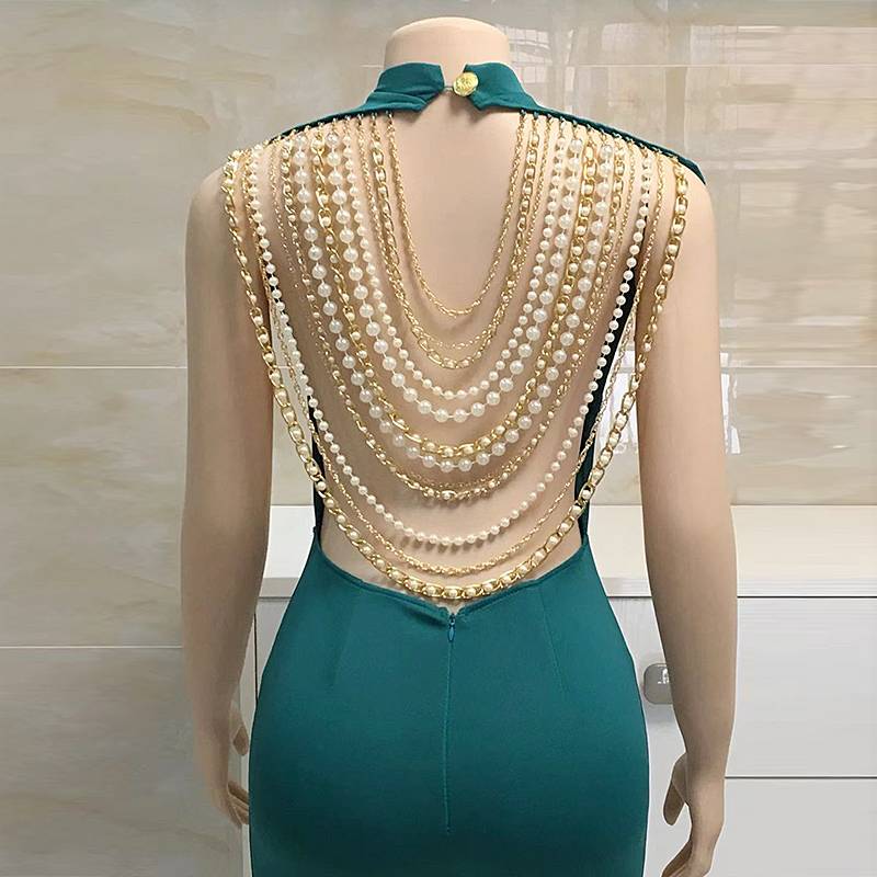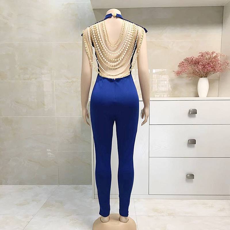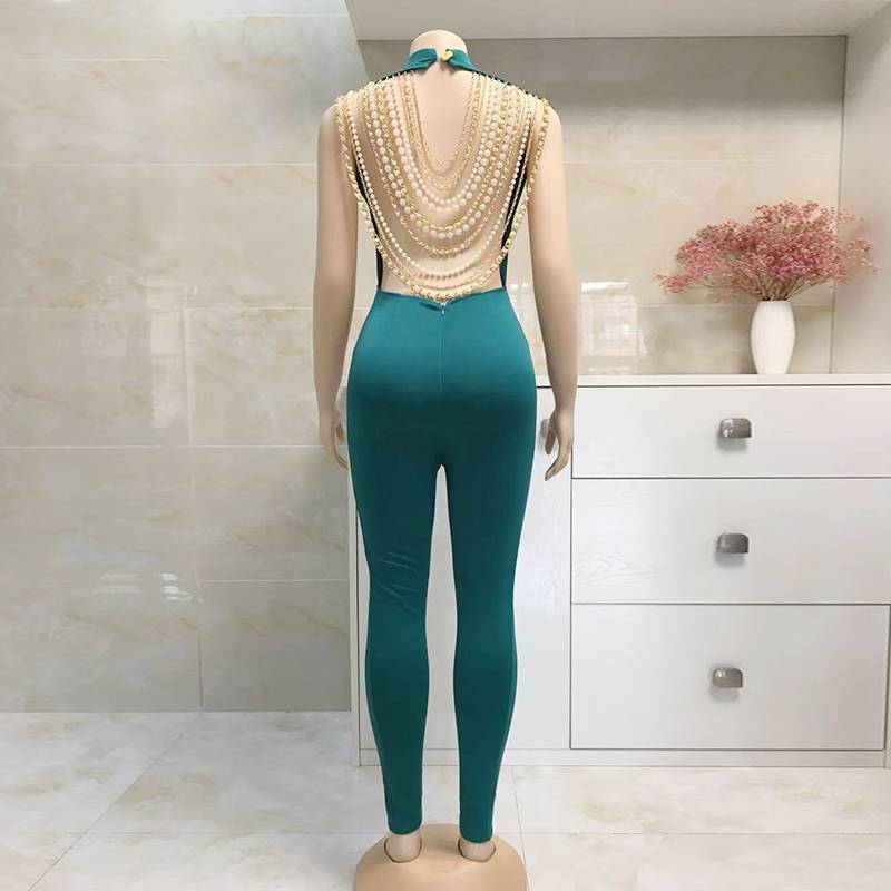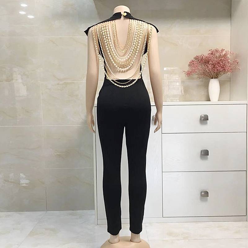 The jumpsuit is perfect for a sleek and modern look. The backless style is adorned with metal chains and pearl beads, adding to its feminine charm and versatility. The polyester and spandex blend material is lightweight, breathable, and comfortable. Coordinate with a wide variety of outfits to create your very own style. This jumpsuit is the perfect way to break out of the ordinary.