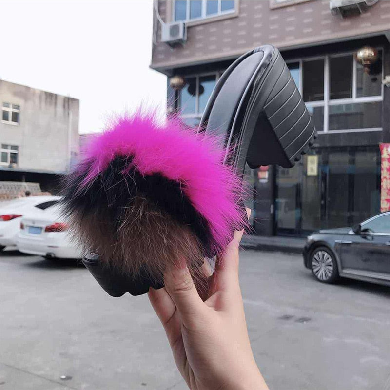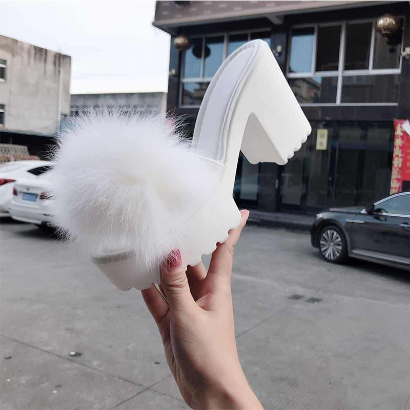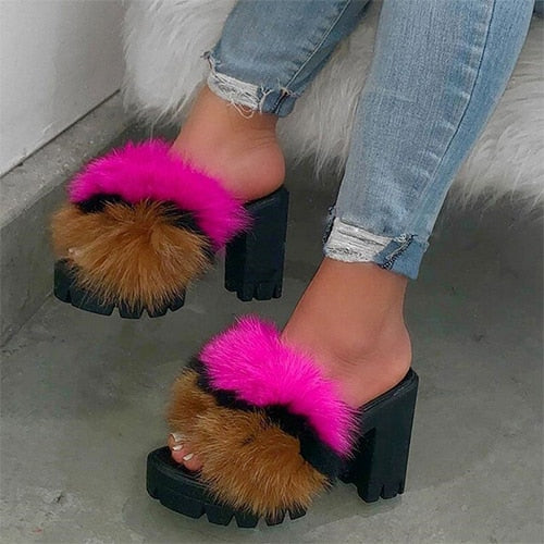 Square Heels Solid Color Sandal with Faux Fur, Rubber, and PU Material