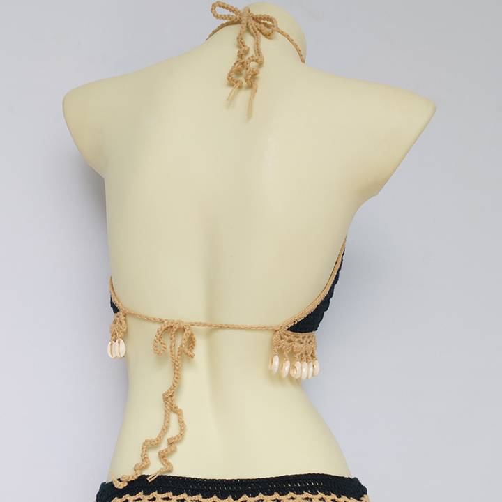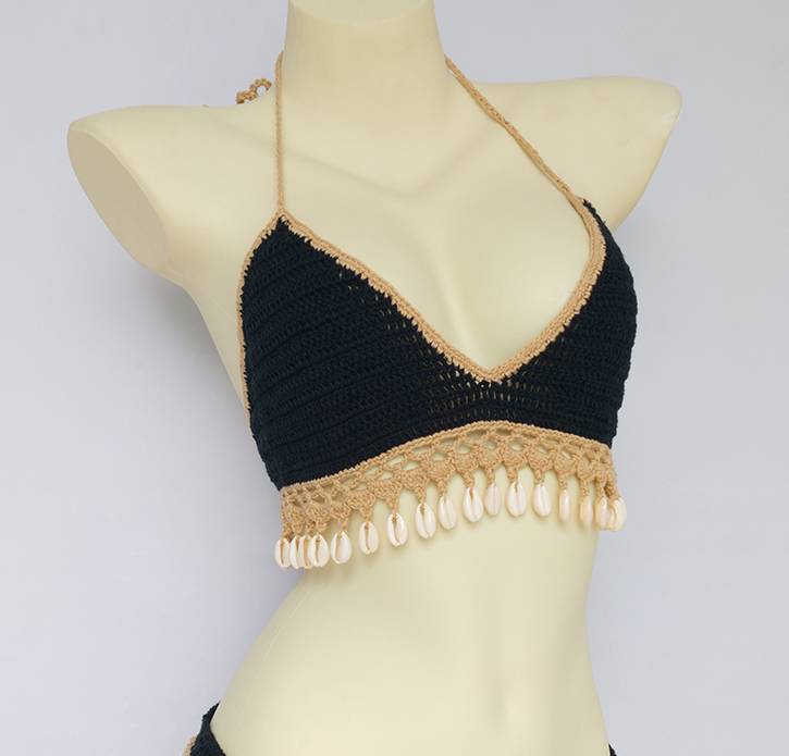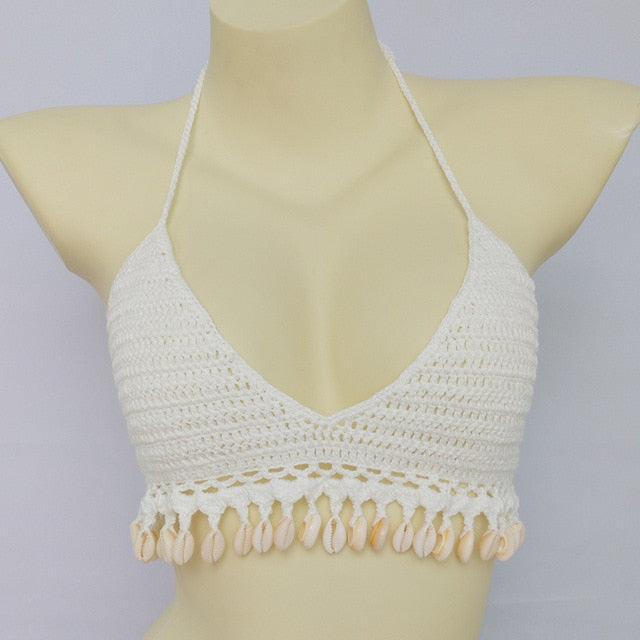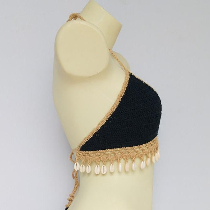 Solid Crochet Bikini Top with Tassel Decoration and Cotton Material
