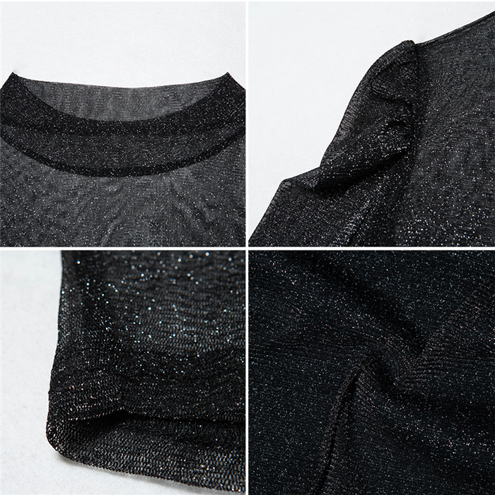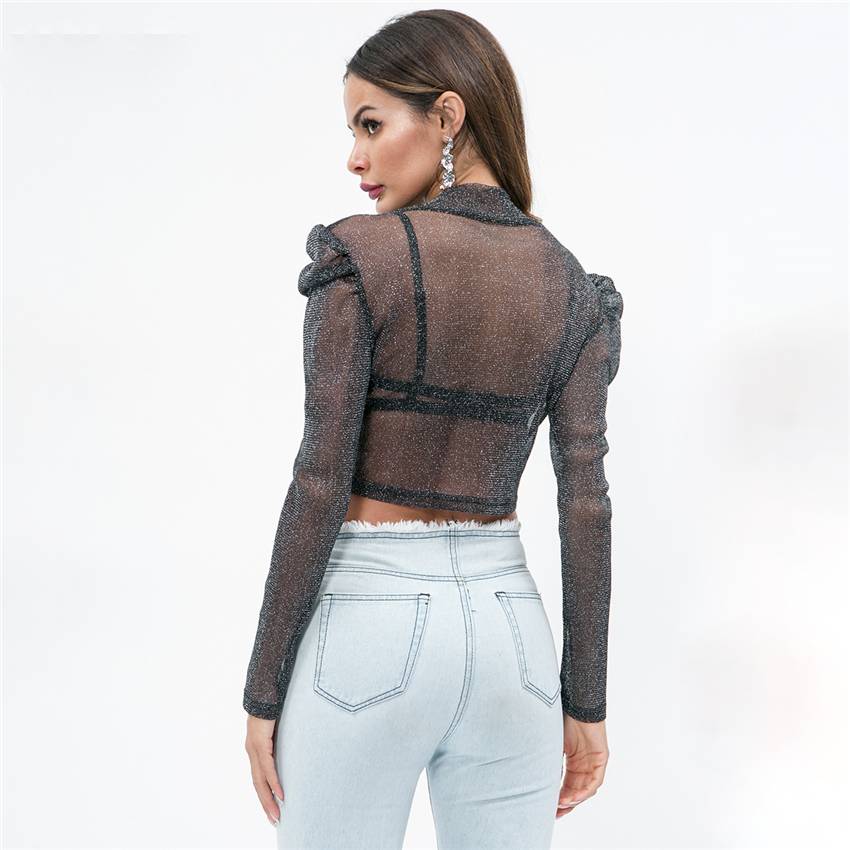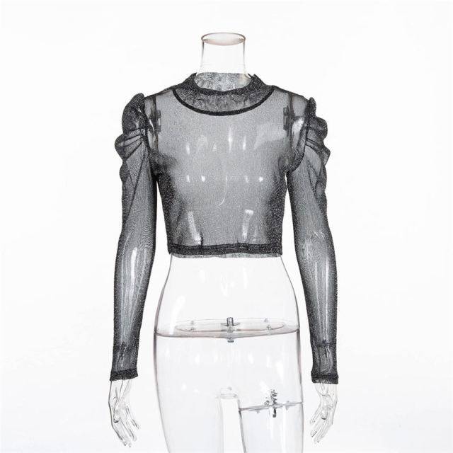 See-Through Mesh Polyester Spandex Crop Blouse with Puff Long Sleeves