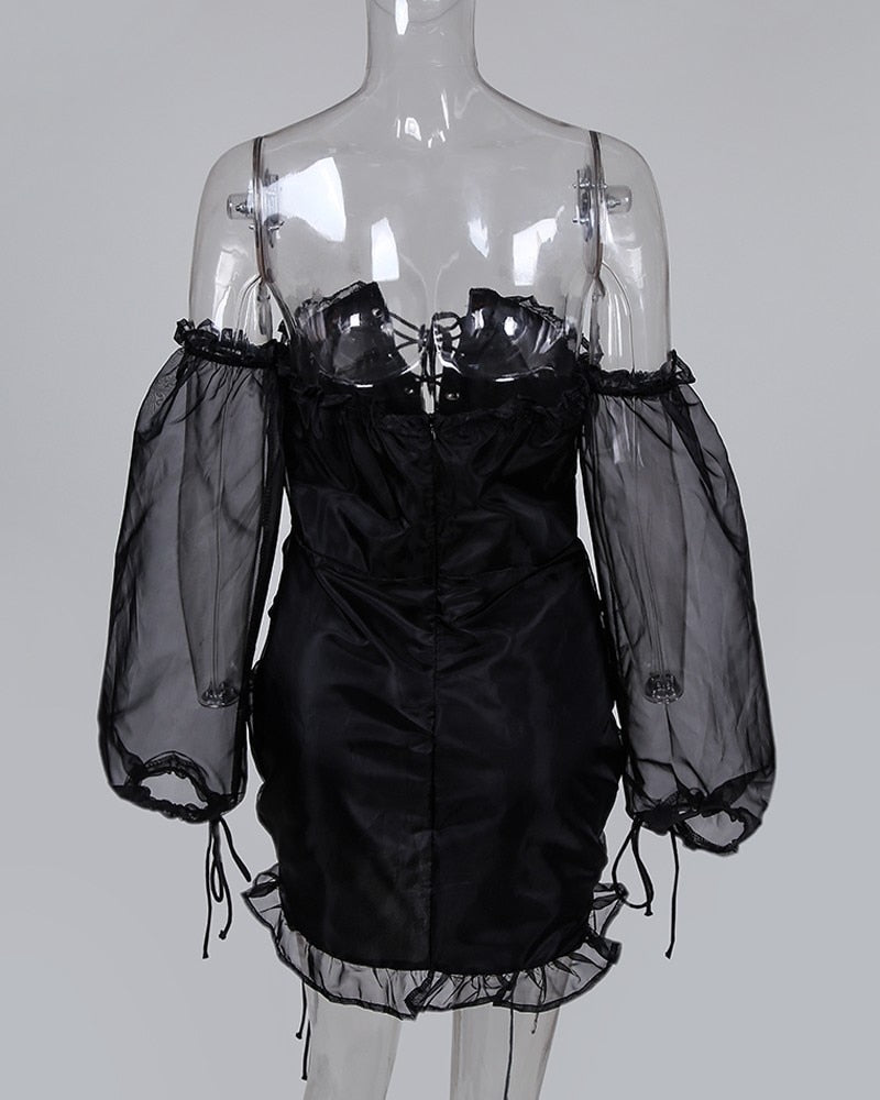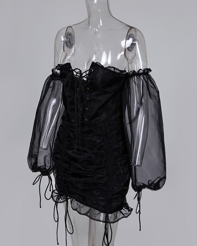 Slash Neck Mini Dress with See Through Sleeve, Drawstring Decoration, and Zipper Closure
