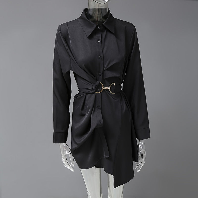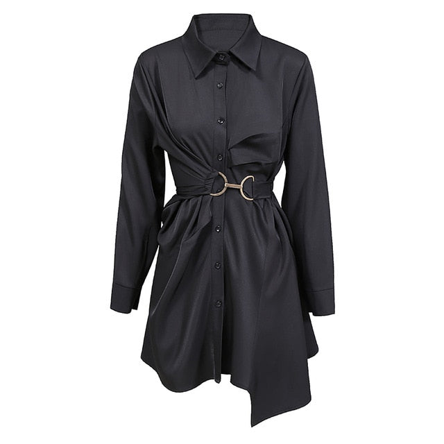 Asymmetric Solid Color Mini Dress with Turn-Down Collar, Button Closure, and Cotton Rayon Material