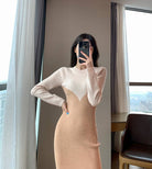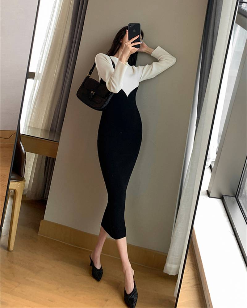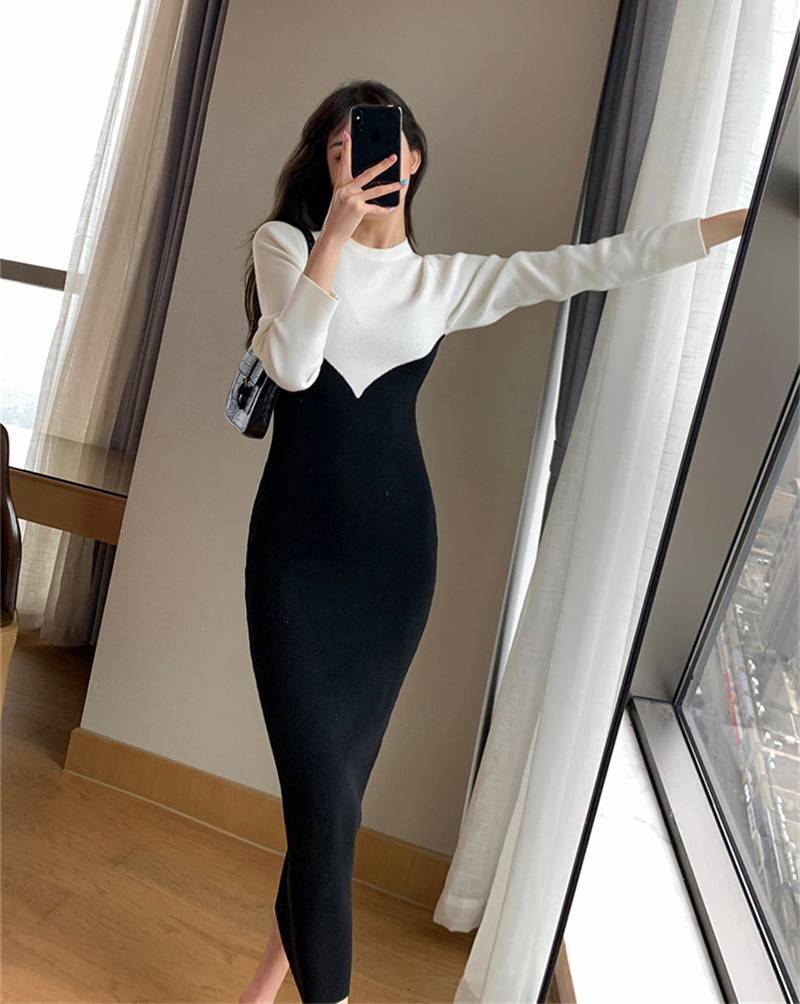 A midi-length dress that has a feminine and flattering fit. This versatile style is a wonderful addition to your casual wardrobe that easily transitions from day to evening. This two tone color scheme offers a delicate contrast for a casual look and the full sleeves are a practical choice that keeps you warm and covered.