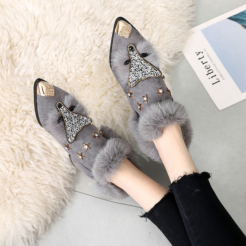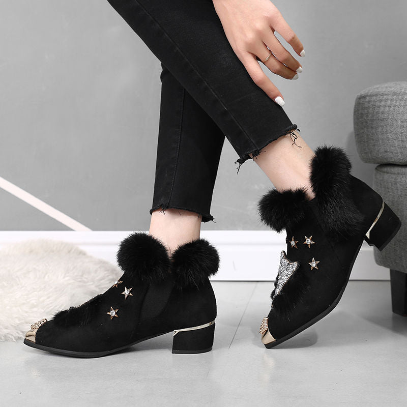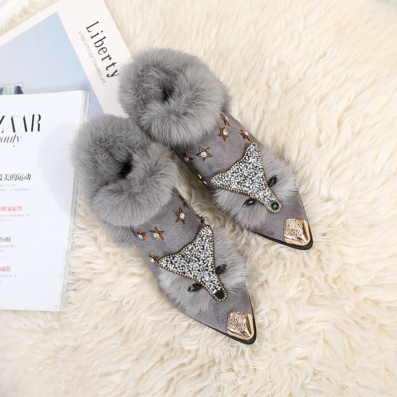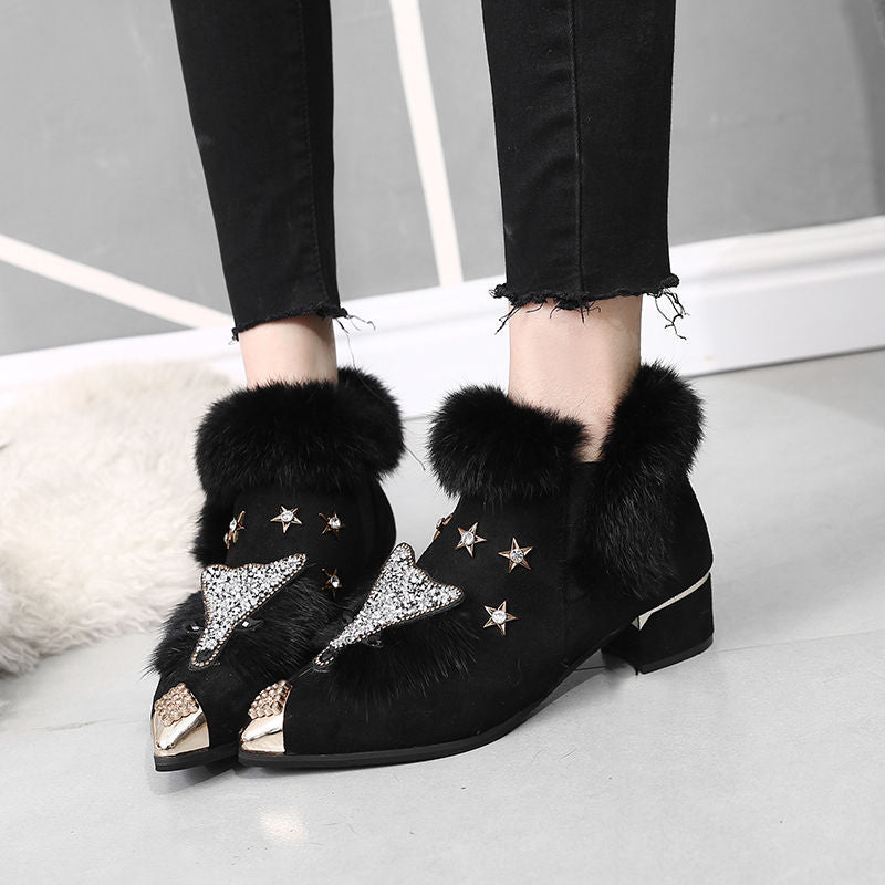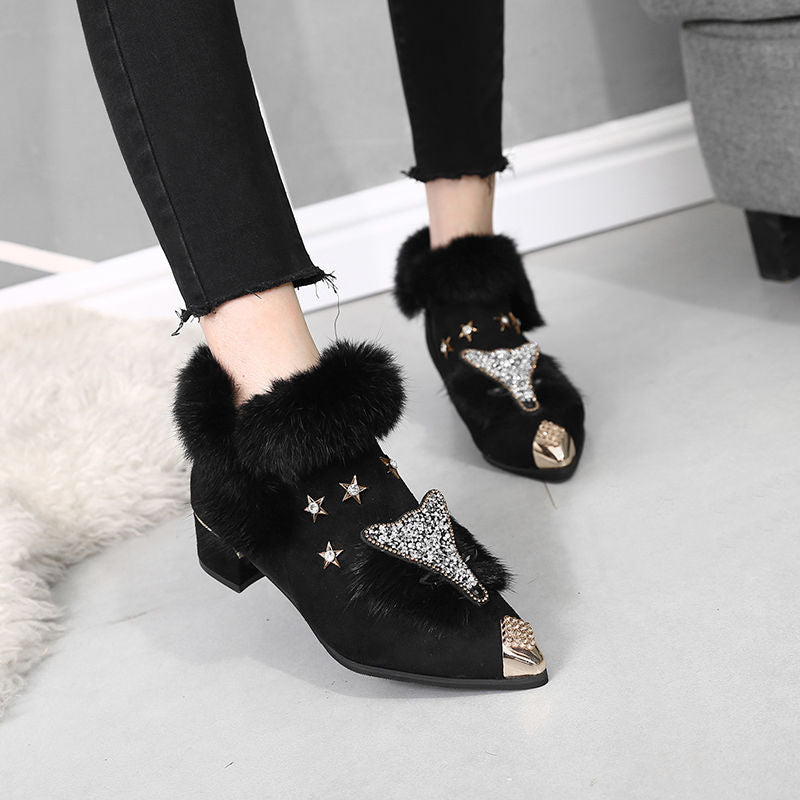 Keep your feet warm and your style on point with these ankle boots. The boots come in a black or gray color option with fur trim and a fox style on the front. The boots also have a rhinestone accent on the heel. The boots are great for cold weather and would look perfect with a sweater dress.