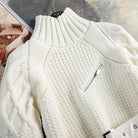 Turtleneck Knitted Sweater With Solid Pattern, Zipper, Belt Decoration, And Mix Material