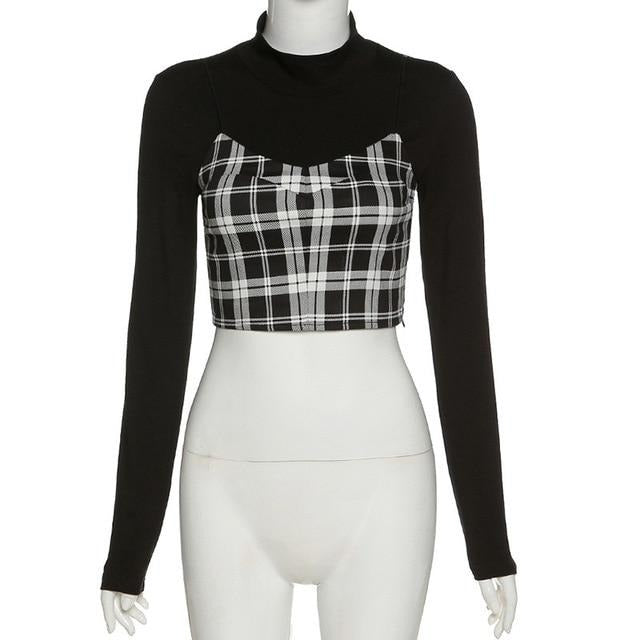 Plaid Patterned Camisole Top and Long-Sleeved Cropped T-Shirts