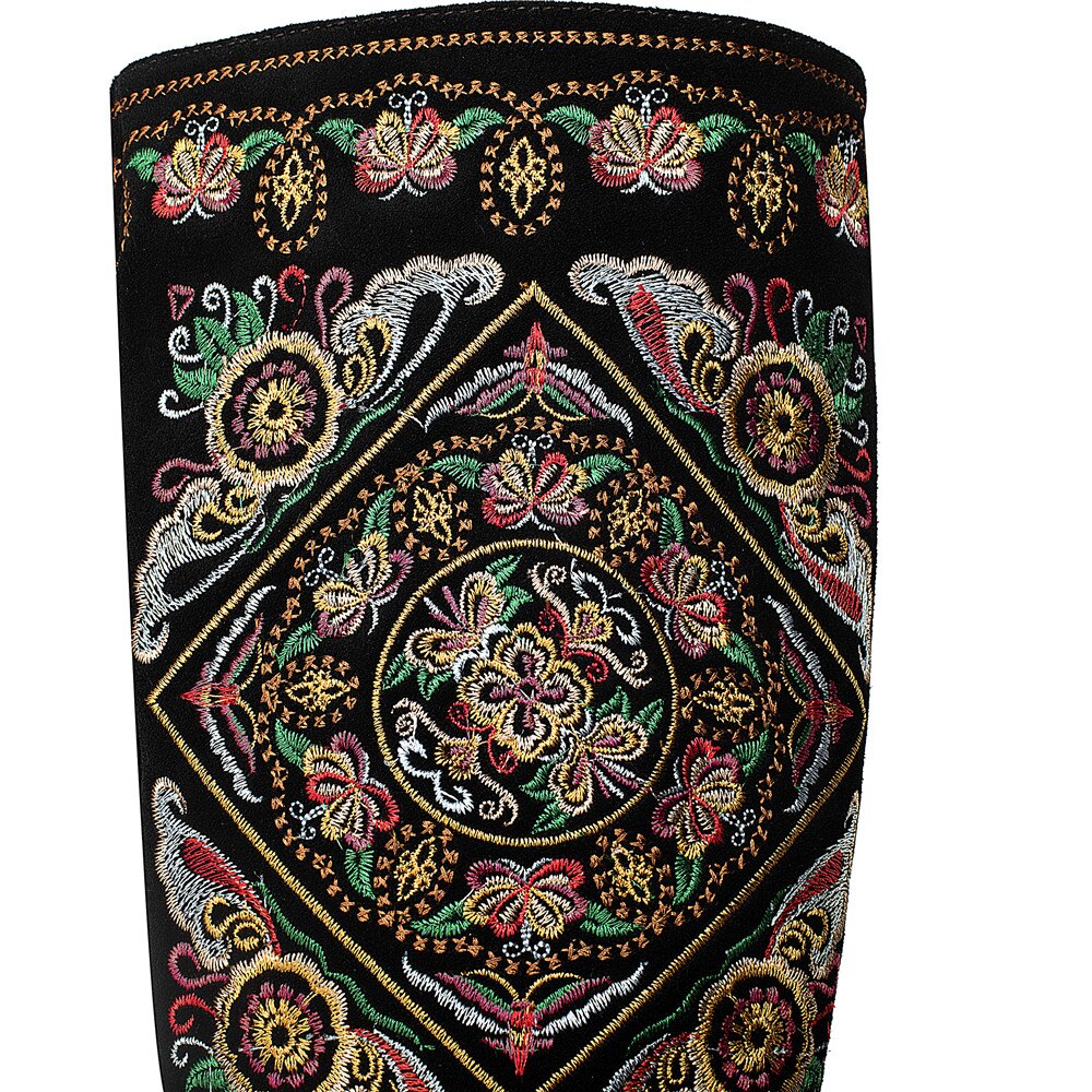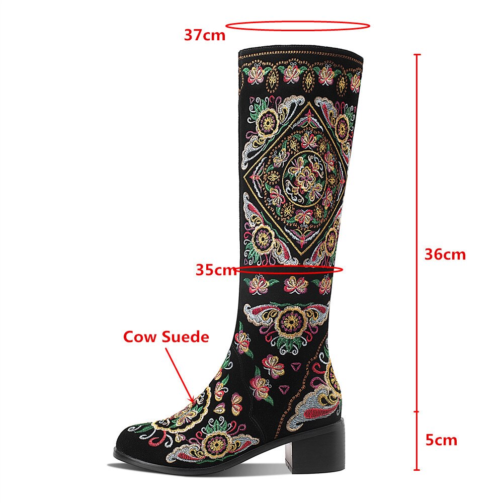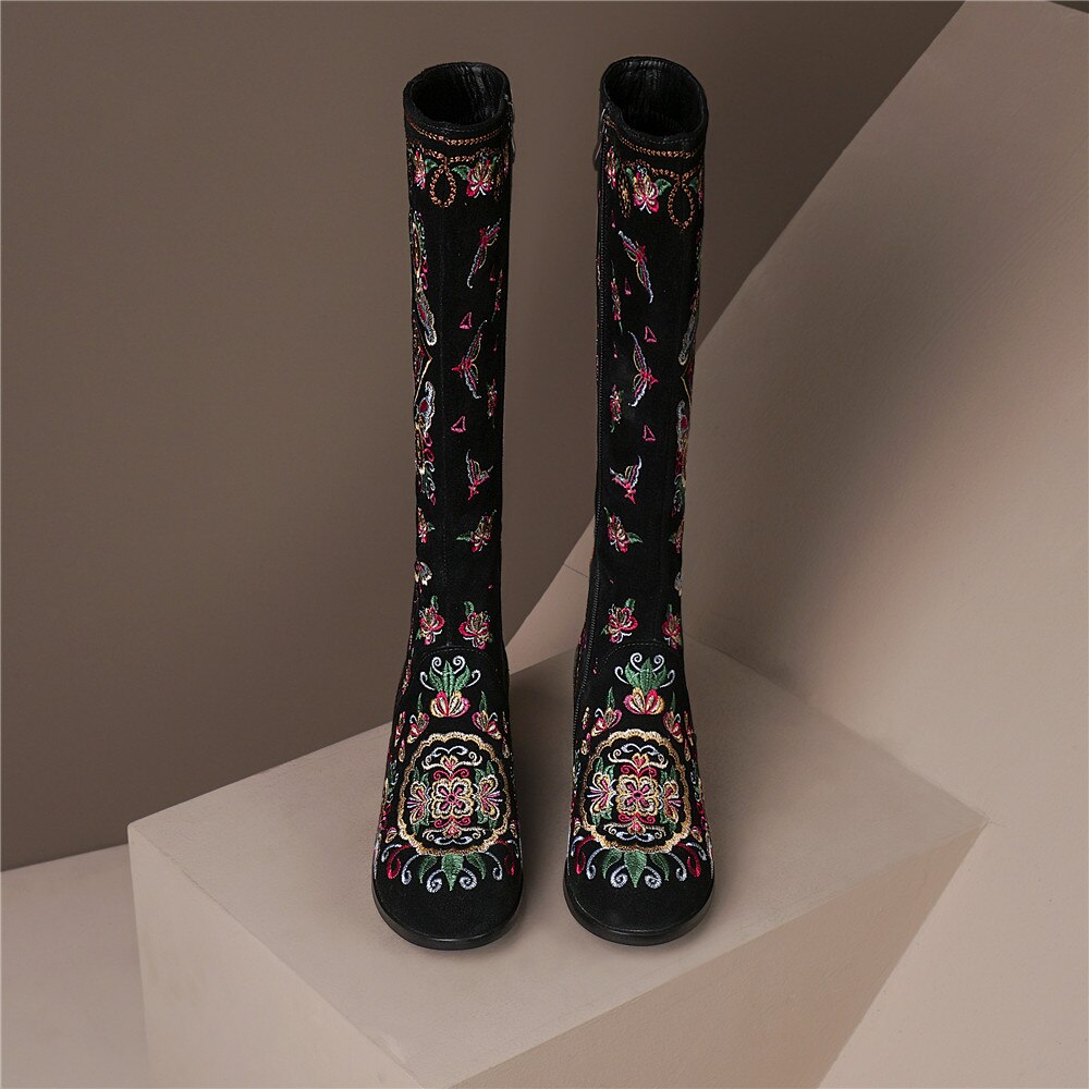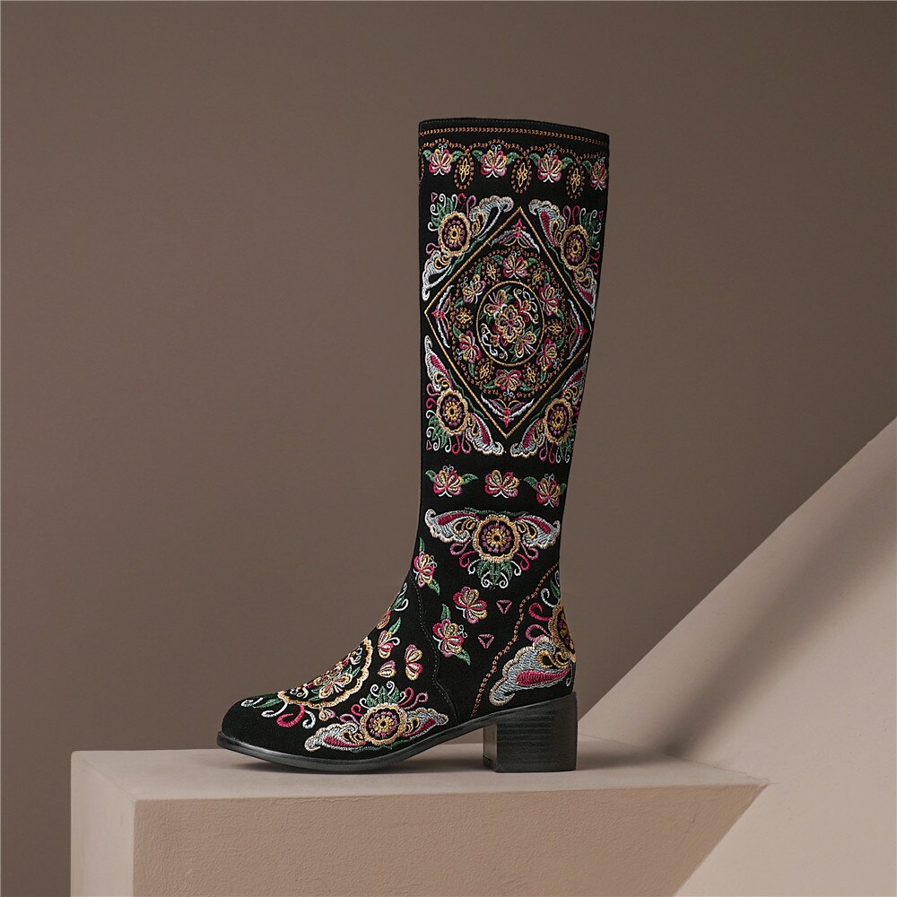 Classic and elegant, these knee-high boots are perfect for the season and are easy to pair with any outfit. With a suede upper, they are warm and stylish. They feature a full embroidery decoration that adds a touch of elegance and sophistication to any outfit. With a square heel, they have a comfortable fit.