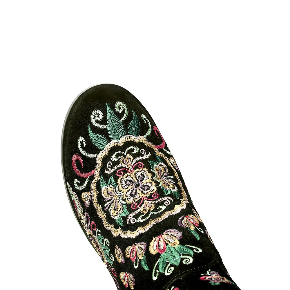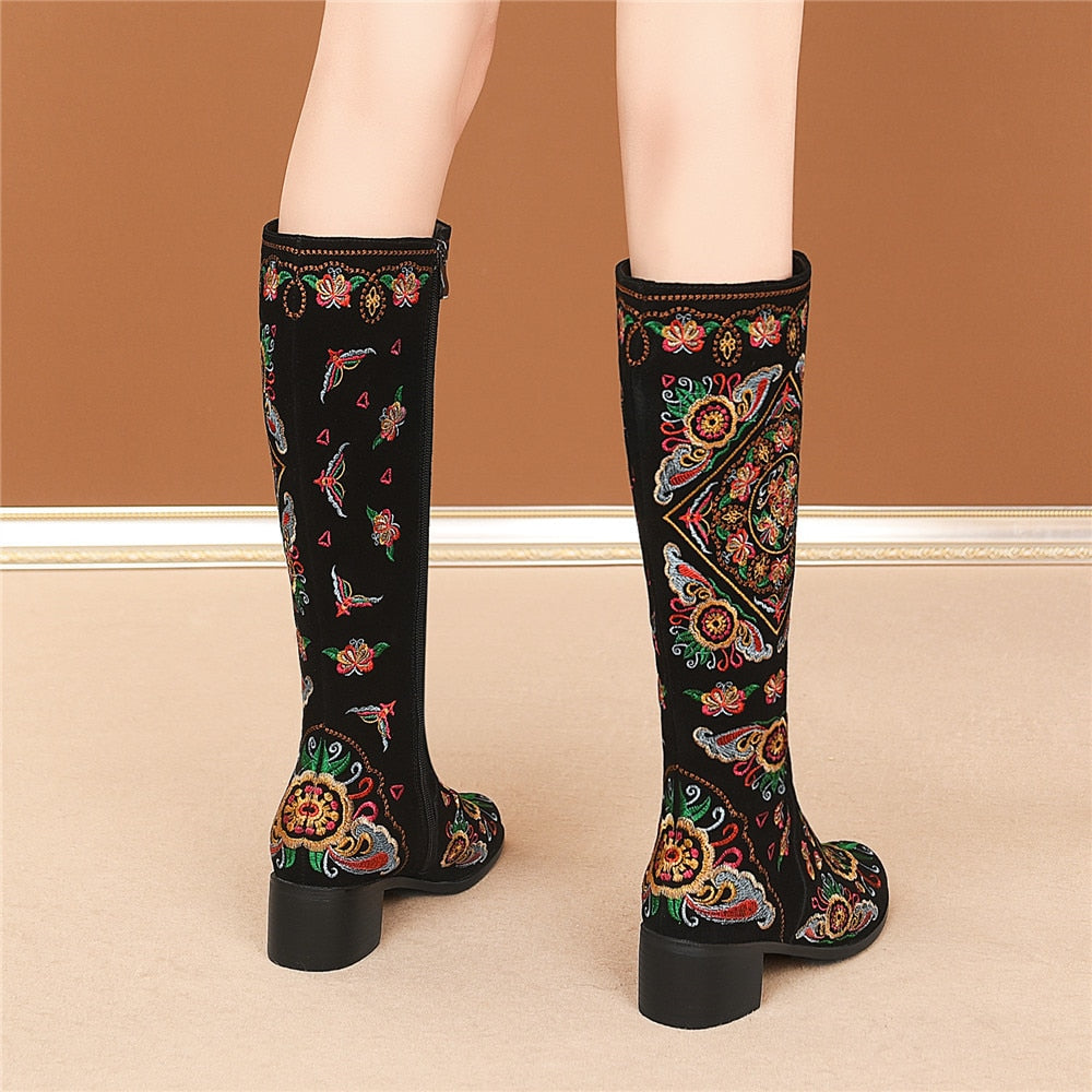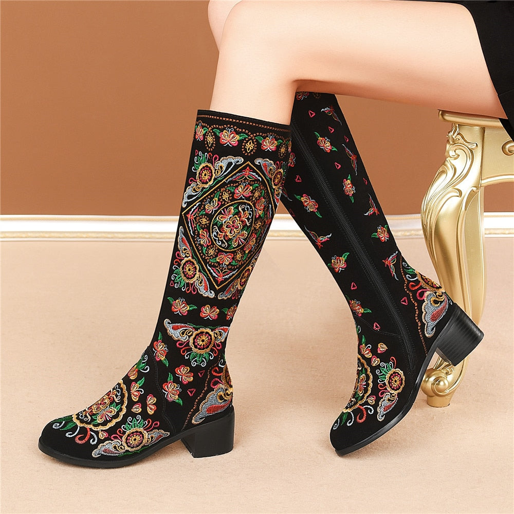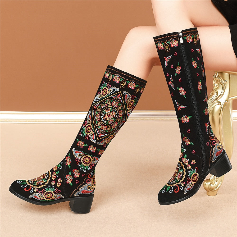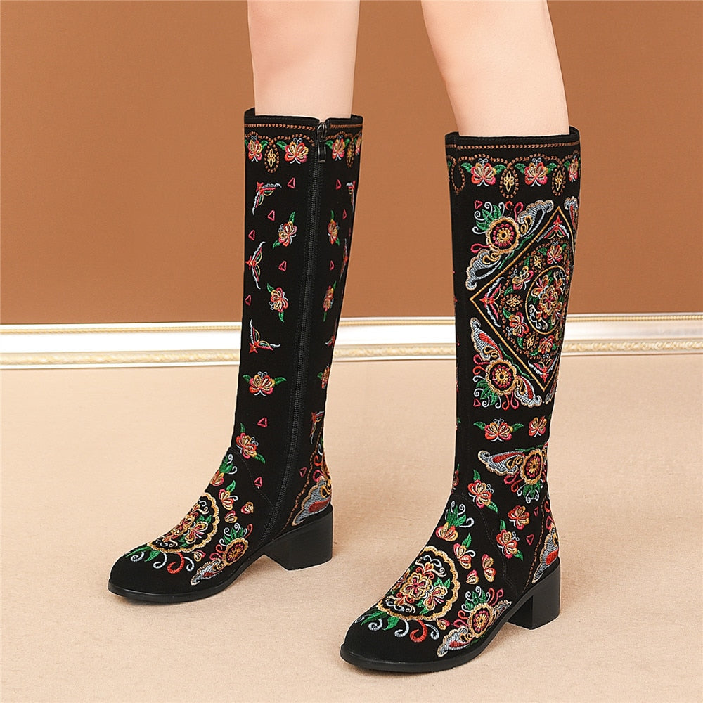 Classic and elegant, these knee-high boots are perfect for the season and are easy to pair with any outfit. With a suede upper, they are warm and stylish. They feature a full embroidery decoration that adds a touch of elegance and sophistication to any outfit. With a square heel, they have a comfortable fit.
