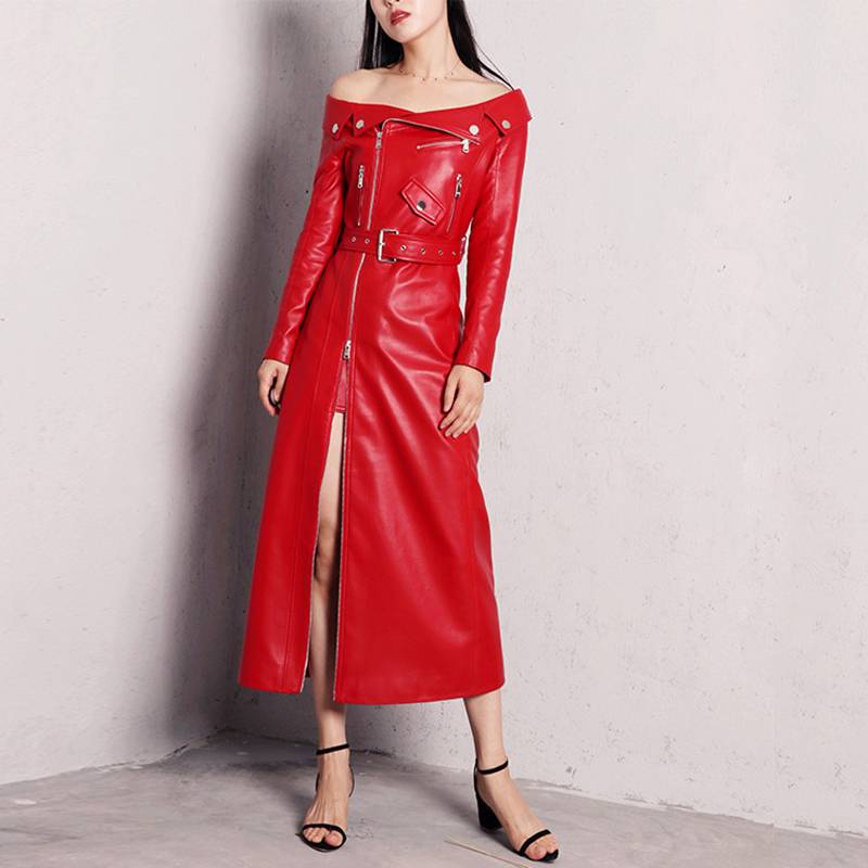 Featuring a slash neck design that is perfect for layering. This PU leather coat is easy to wear because of the zipper closure.  The belt, zipper, and a metal plate is a perfect decoration to this coat.