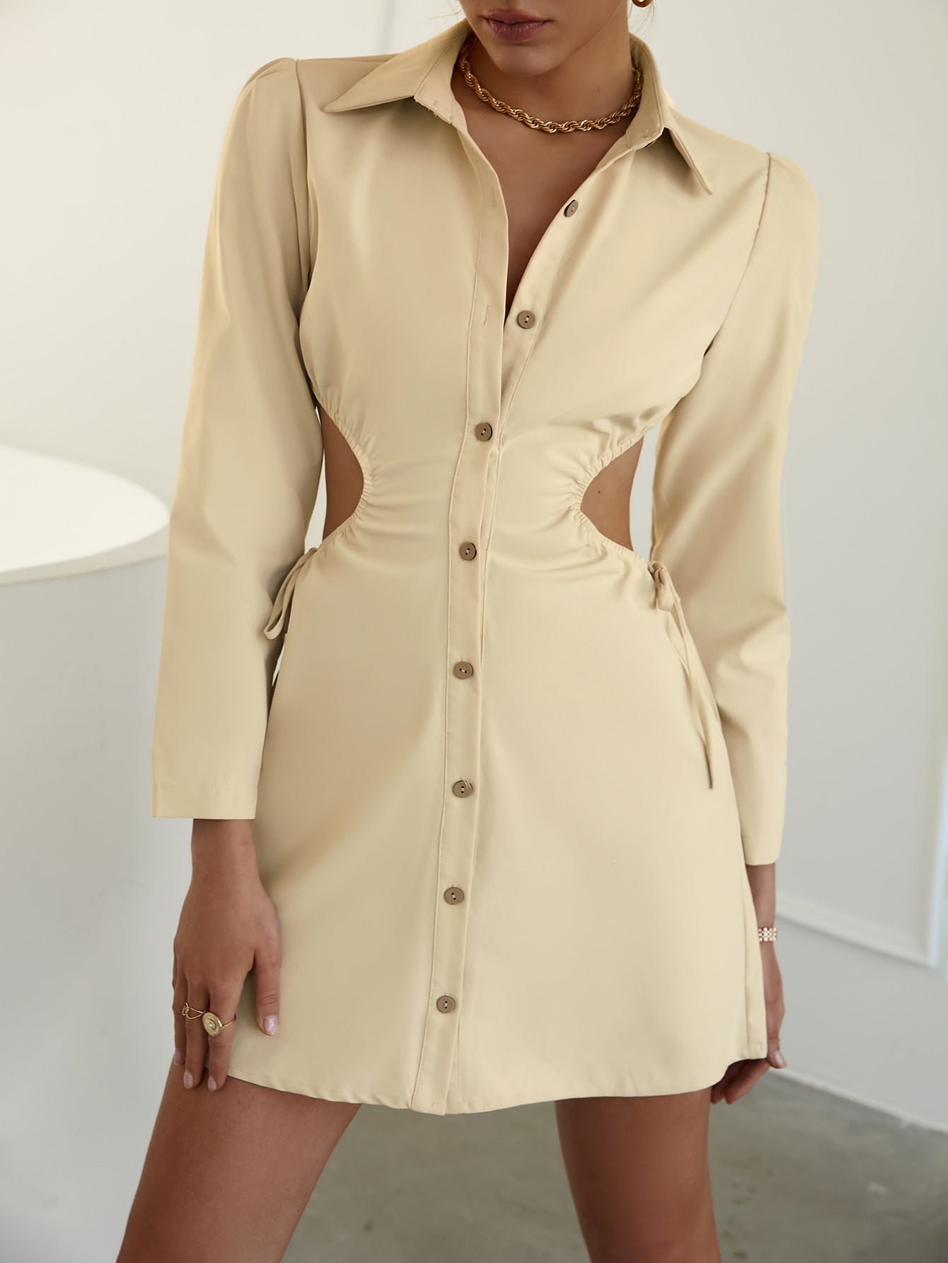This darling dress features a gorgeous apricot color and has a chic A-line shape. The polyester fabric is lightweight and soft, and the turn-down collar is perfect for the office. This mini dress has a hollow-out design that offers just the right amount of coverage, and the single-breasted style will keep you looking professional. It has long sleeves for cooler days, and the long length is perfect for all body types.
